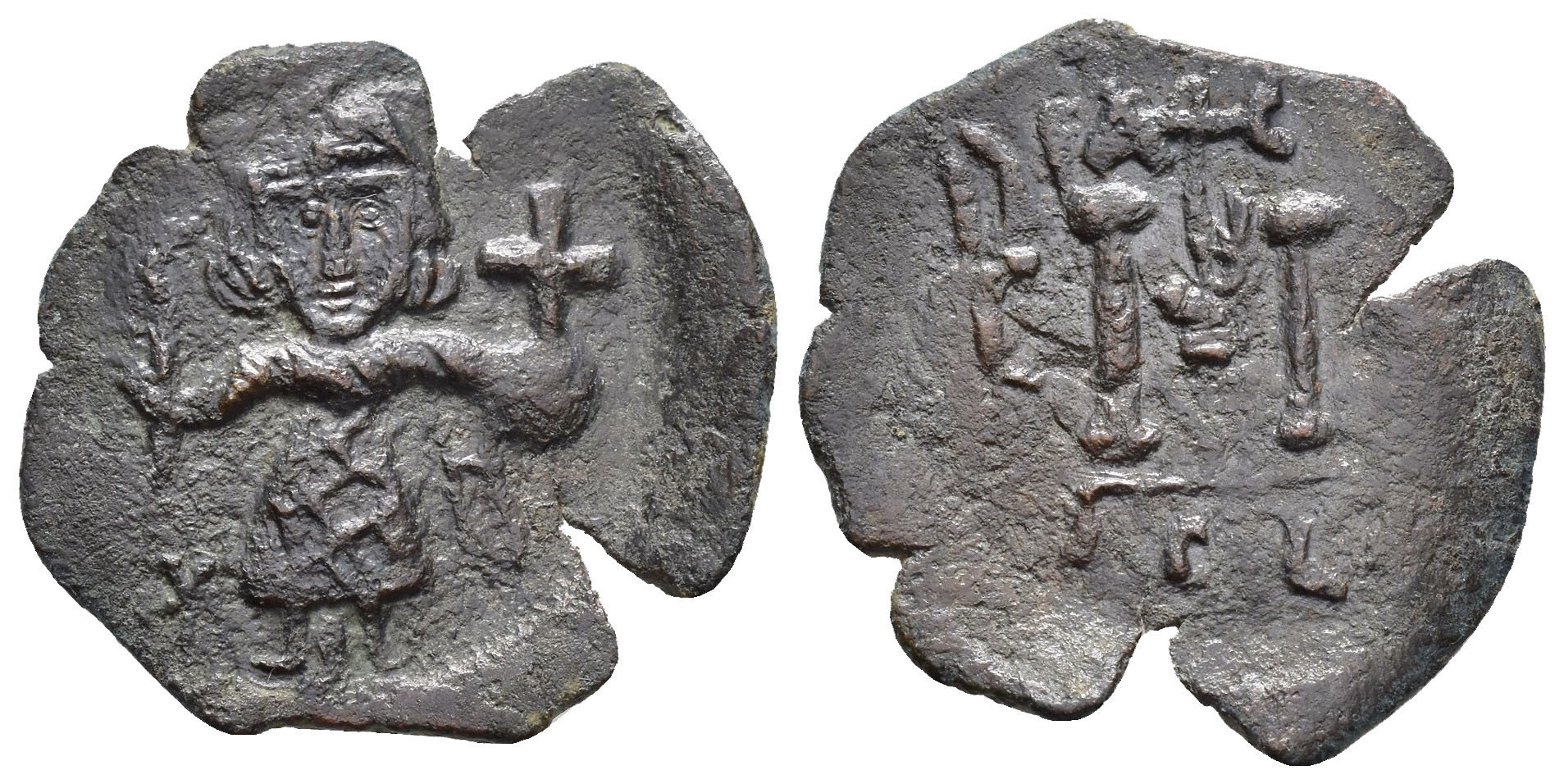 IMPERIO BIZANTINO. FILÍPICO O ANASTASIO II. Follis. Siracusa (¿711-715?). A/ El emperador de frente con cetro y globo crucífero. R/ M, encima monograma, en exergo SCL, a los lados PC-P? AE 3,67 g. 23,8 mm. SBB-1475. Cospel abierto. MBC.