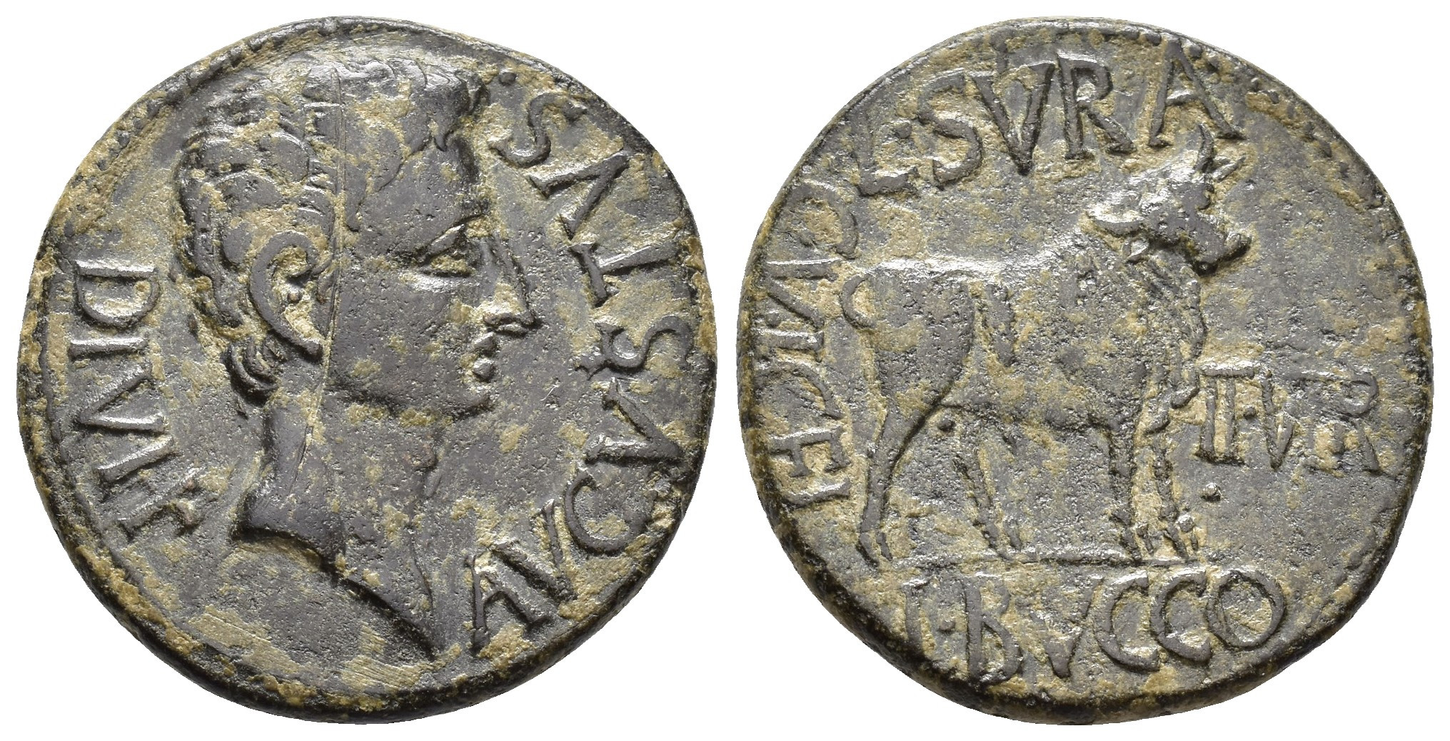 HISPANIA ANTIGUA. CELSA. Augusto. As. A/ Cabeza a der.; AVGVSTVS DIVI F. R/ Toro parado a der., delante II VIR, detrás C V I CEL, encima L SVRA, debajo L BVCCO. AE 11,65 g. 28 mm. I-808; APRH-271; ACIP-3162; CC-4596, mismo ejemplar. Raya en anv. Pátina oscura. MBC.