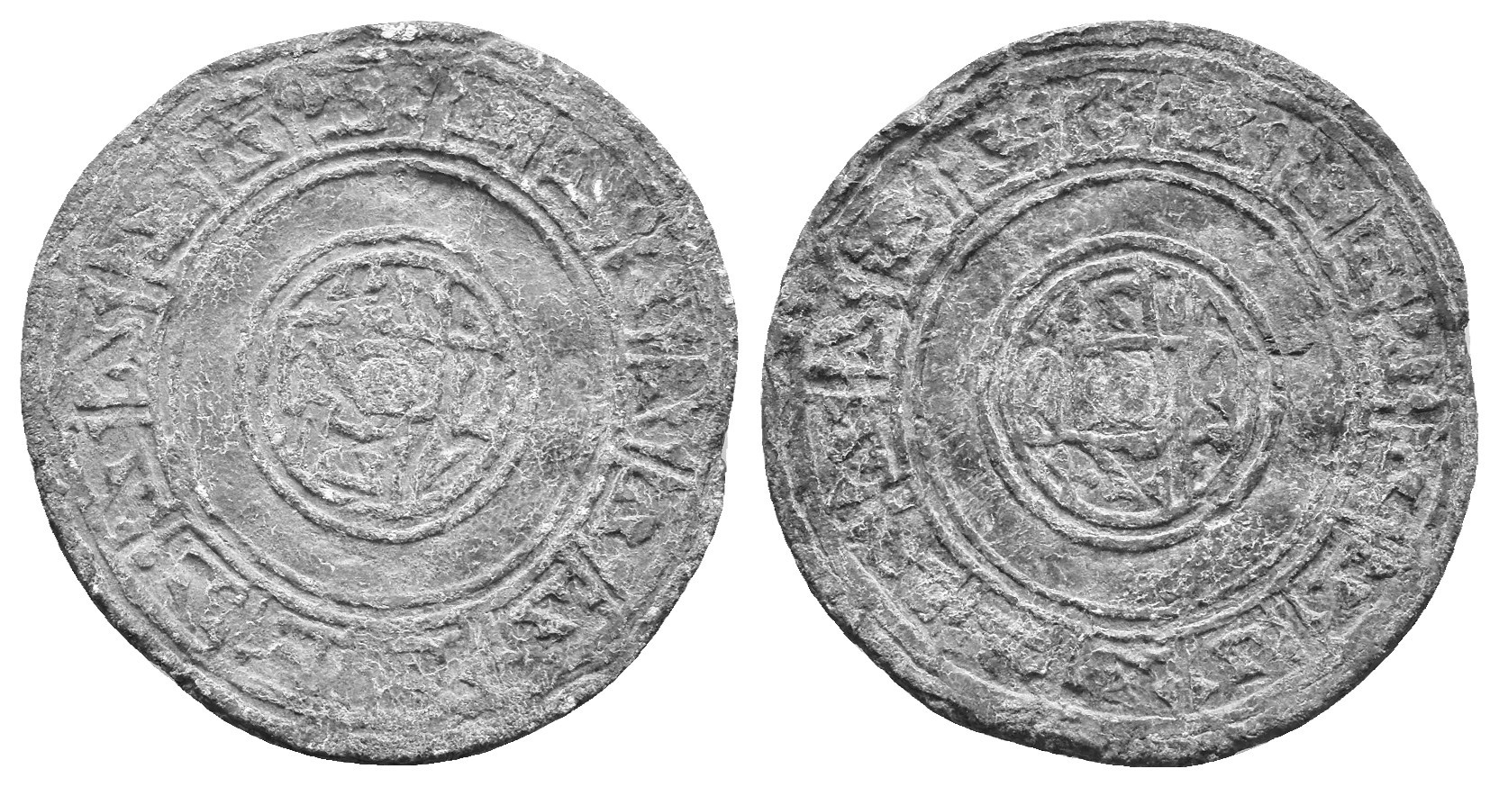 ACUÑACIONES HISPANO-ÁRABES. Amuleto de plomo. Al-Andalus. S. XI-XII. Tres círculos concéntricos de doble orla, enmarcan una leyenda central de 4 líneas y una leyenda en orla. PB 4,4 g. 28,22 mm. MBC-.