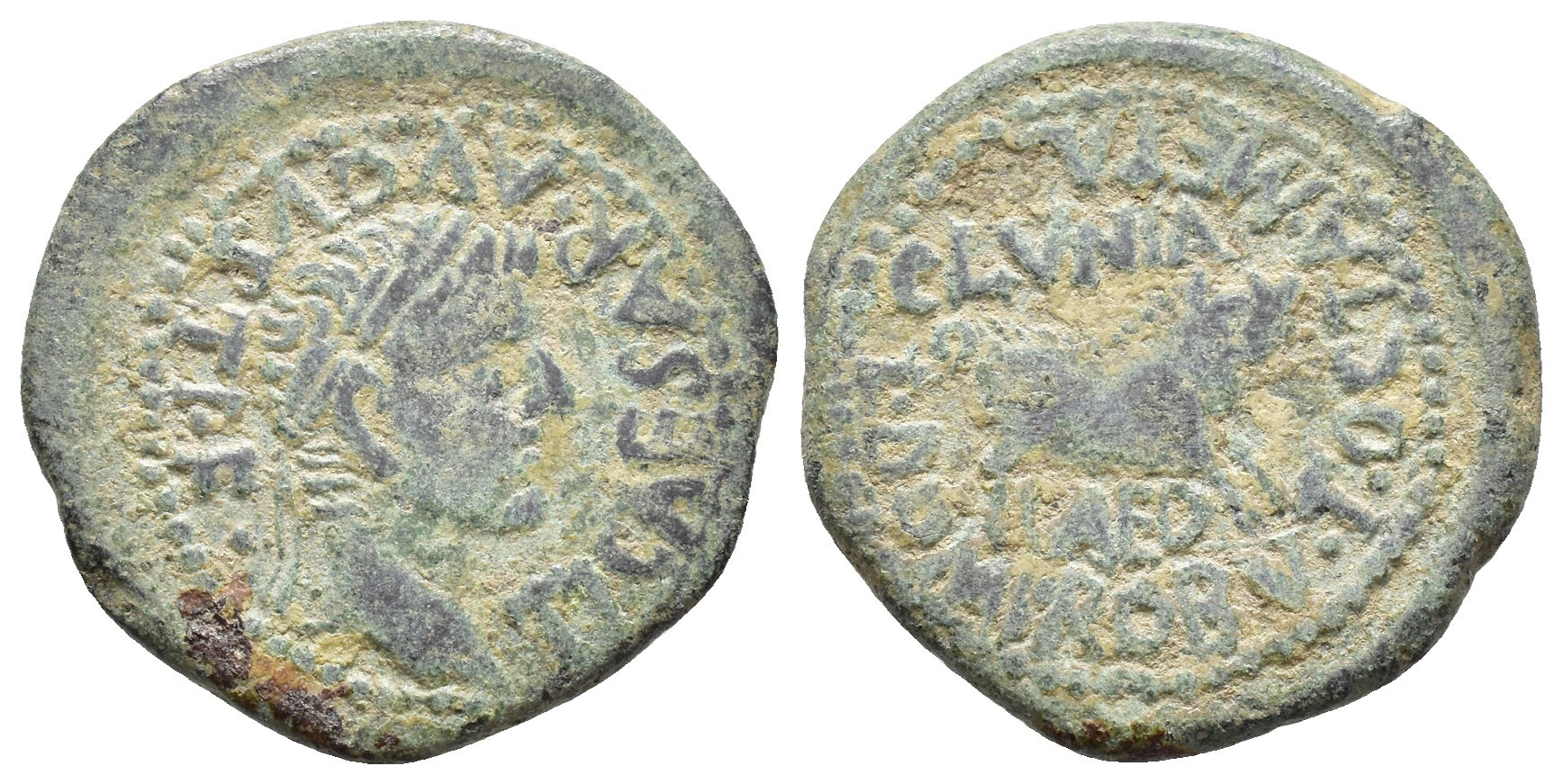HISPANIA ANTIGUA. CLUNIA. Tiberio. Semis. A/ Cabeza laureada a der.; TI CAESAR AVGVSTI F. R/ Jabalí a der., encima CLVNIA, debajo AED; L DOMIT ROBV T OCTA METAL. AE 6,09 g. 24 mm. I-842; APRH-453; ACIP-3173; CC-5083, mismo ejemplar. Pátina verde claro. MBC-. Muy escasa.