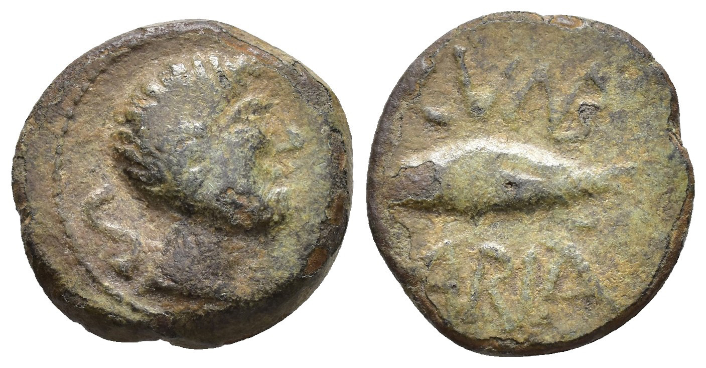 HISPANIA ANTIGUA. CUMBARIA. Semis. A/ Cabeza masculina a der., detrás S. R/ Atún a izq., CVNB/ARIA. AE 5,31 g. 19,6 mm. I-880; ACIP-2621; CC-3206, mismo ejemplar. BC+. Muy escasa.
