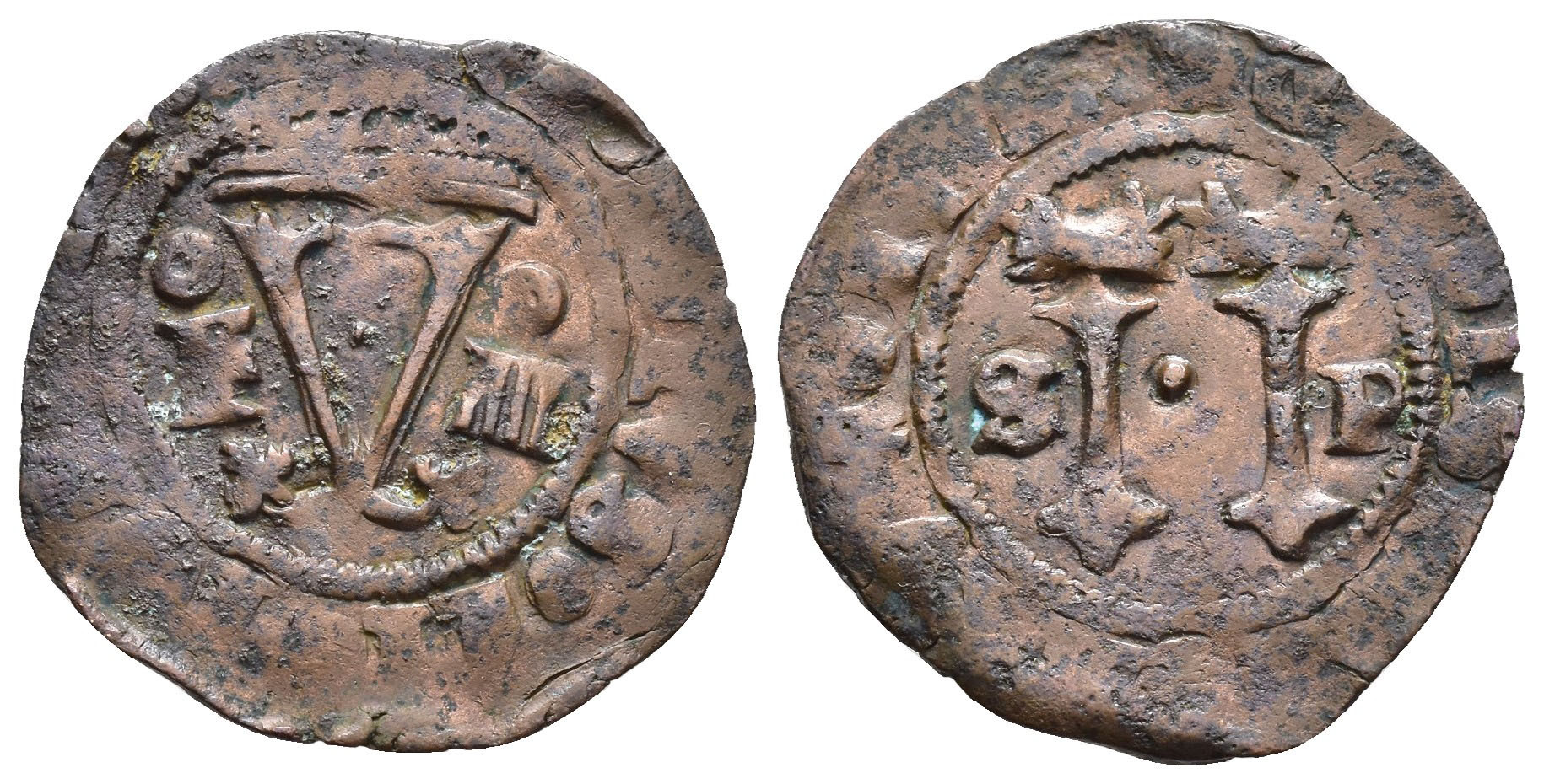 JUANA Y CARLOS. 4 maravedís. Santo Domingo. F-IIII, S P. CU 2,6 g. 24,9 mm. AC-35. Leves oxidaciones. MBC+.
