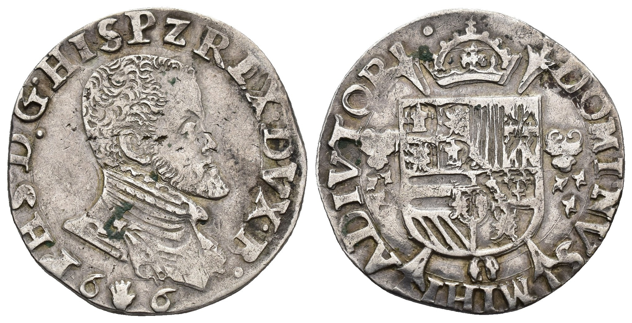 FELIPE II. 1/5 escudo. 1566. Amberes. Ceca entre 6 y 6. AR 6,8 g. 27,8 mm. Vti.-853 var. Hojitas y leves oxidaciones. MBC.