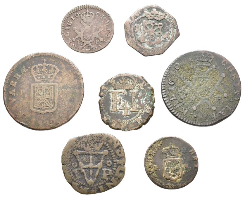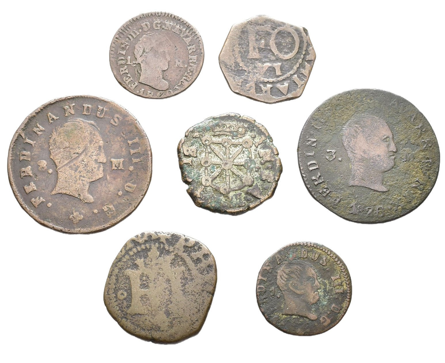 FELIPE IV. Lote de 7 piezas de Navarra. 3 de Felipe IV y 4 de Fernando VII. De 1 a 8 maravedís. BC-/BC+.