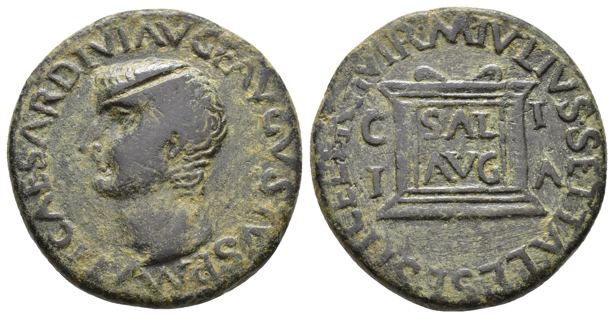 HISPANIA ANTIGUA. ILICI. Tiberio. As. A/ Cabeza a izq.; TI CAESAR DIVI AVG F AVGVSTVS P M. R/ Altar con SAL/AVG, en campo C-I/I-A; M IVLIVS SETTAL L SESTI CELER II VIR. AE 13,38 g. 28 mm. I-1522; APRH-196b; ACIP-3207a; CC-4440, mismo ejemplar. Raya en anv. Pátina verde. MBC.