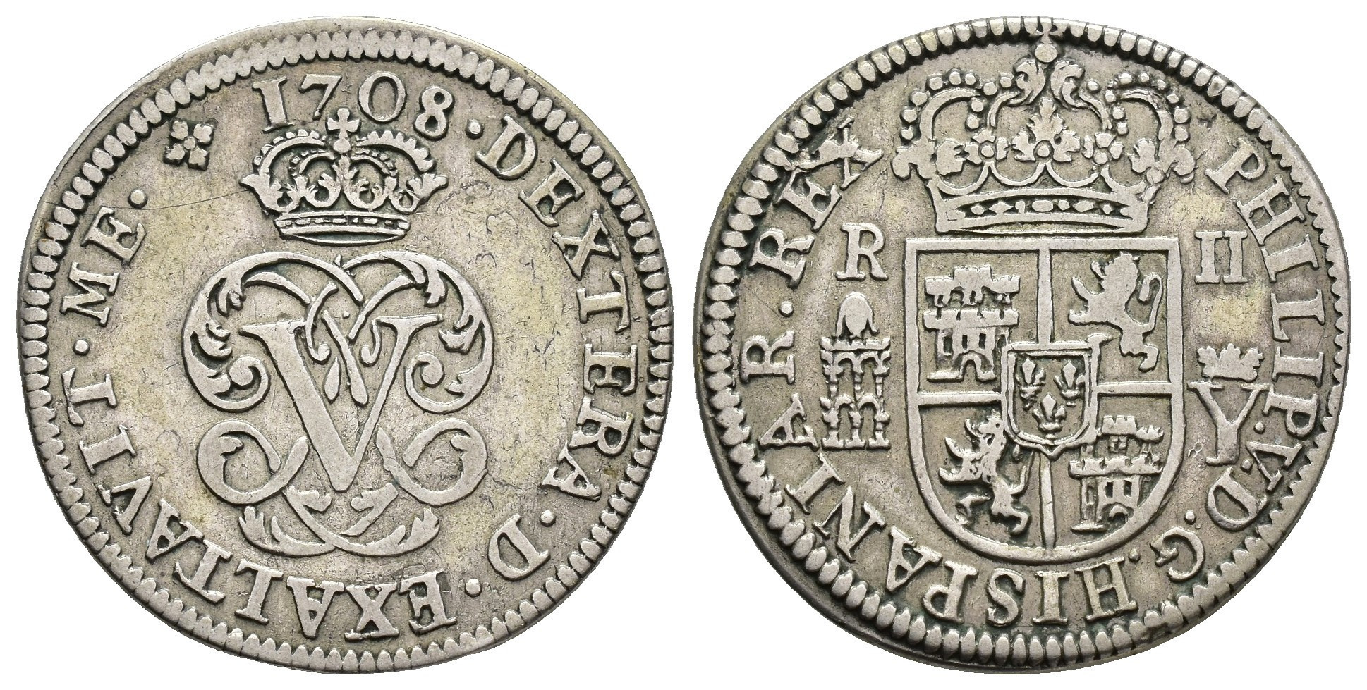 FELIPE V. 2 reales. 1708. Segovia. Y. Palma izq. sobre der. AR 5,32 g. 26,2 mm. VI-757; AC-941. MBC.