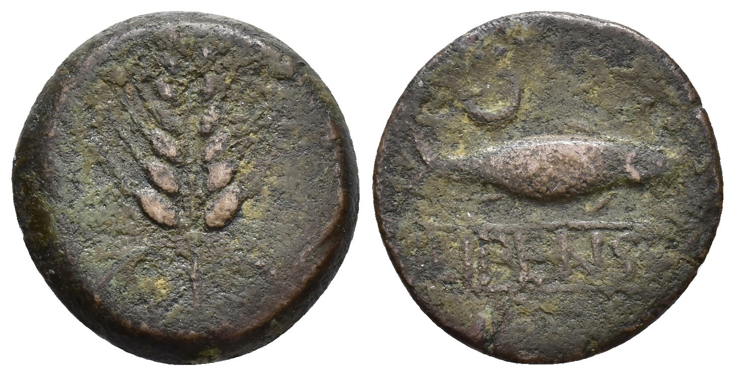 HISPANIA ANTIGUA. ILIPA. Cuadrante. A/ Espiga. R/ Sábalo a der.; encima creciente, debajo, entre líneas, ILIPENSE. AE 4,79 g. 19,8 mm I-1538; ACIP-2338; CC-3251, mismo ejemplar. Pátina verde oscuro. MBC-/BC+. Rara.