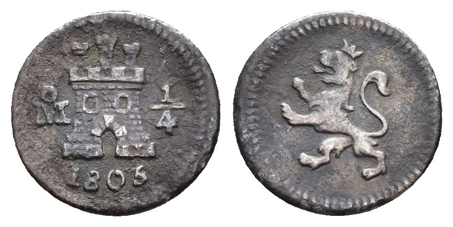 CARLOS IV. 1/4 real. 1805. México. AR 0,78 g. 11,9 mm. VI-124; AC-136. Leves erosiones. MBC/MBC-.