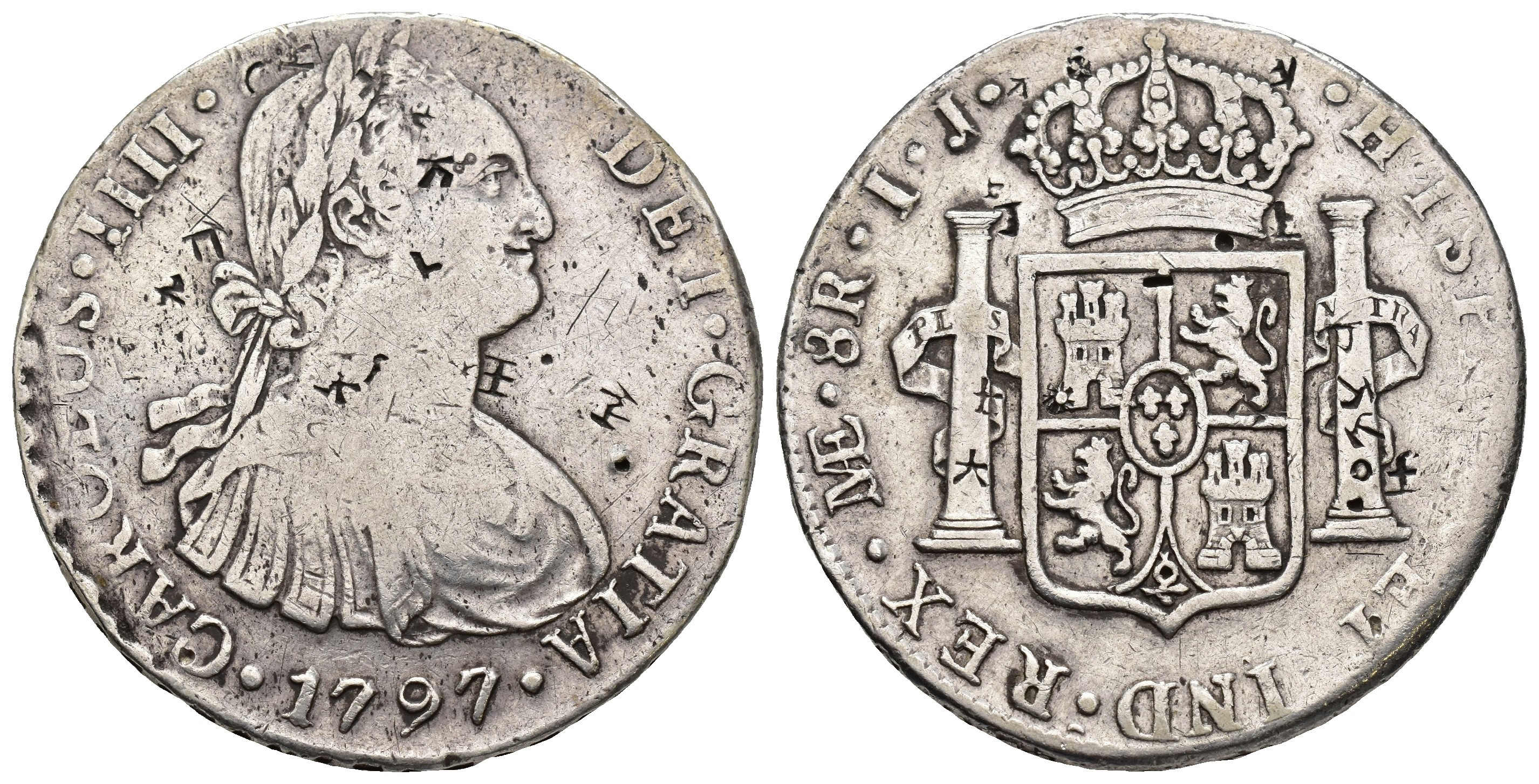 CARLOS IV. 8 reales. 1797. Lima. IJ. Resellos chinos. AR 26,78 g. 39,2 mm. VI-759; AC-915. Resellos orientales. MBC-.