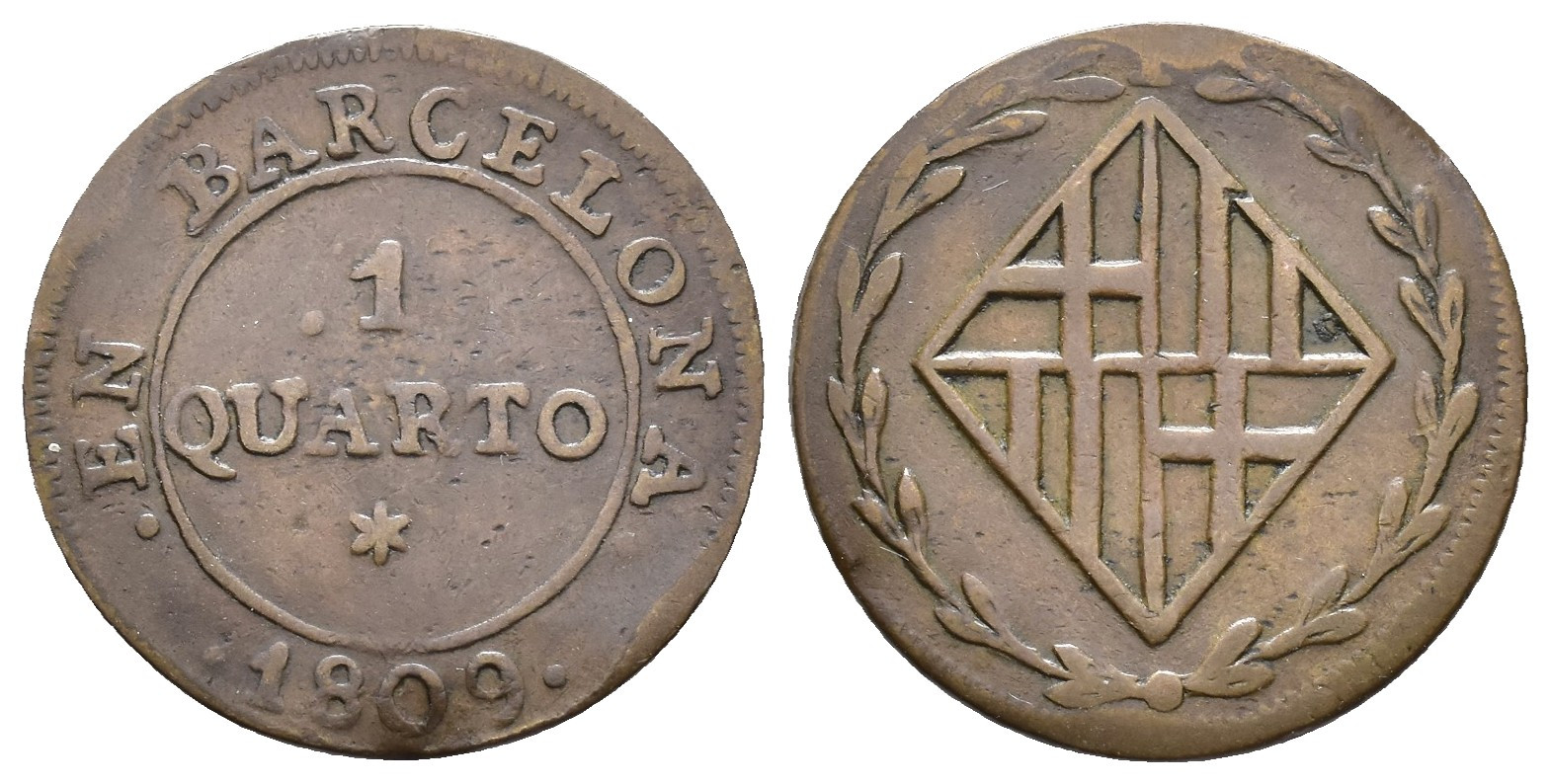 OCUPACIÓN NAPOLEÓNICA DE CATALUÑA. Cuarto. 1809. Barcelona. CU 2,41 g. 20,9 mm. VI-3; AC-3. MBC-/MBC.