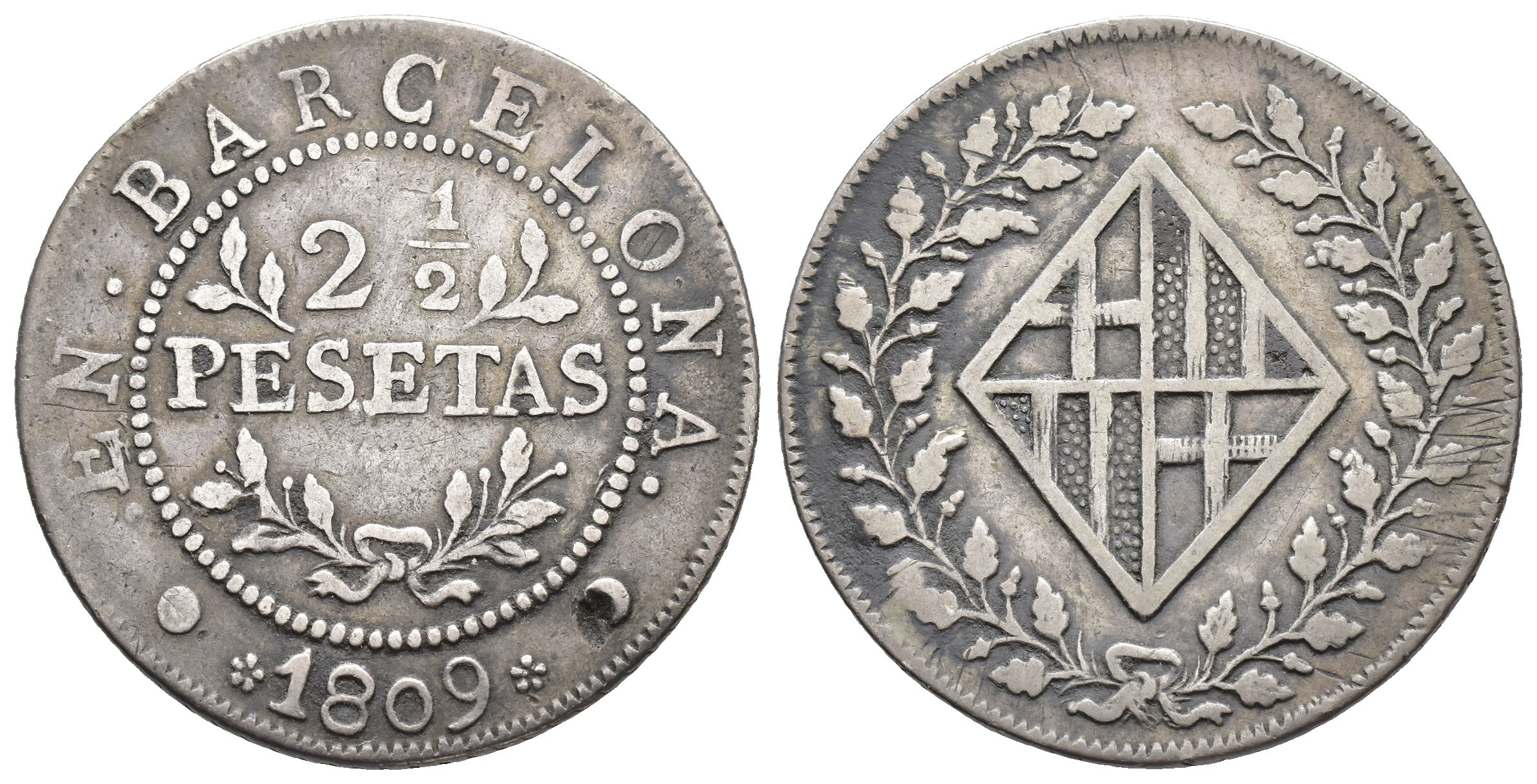 OCUPACIÓN NAPOLEÓNICA DE CATALUÑA. 2 1/2 pesetas. 1809. Barcelona. AR 13,14 g. 32,7 mm. VI-30; AC-42. Golpecito en anv. y rayas de ajuste. MBC-.
