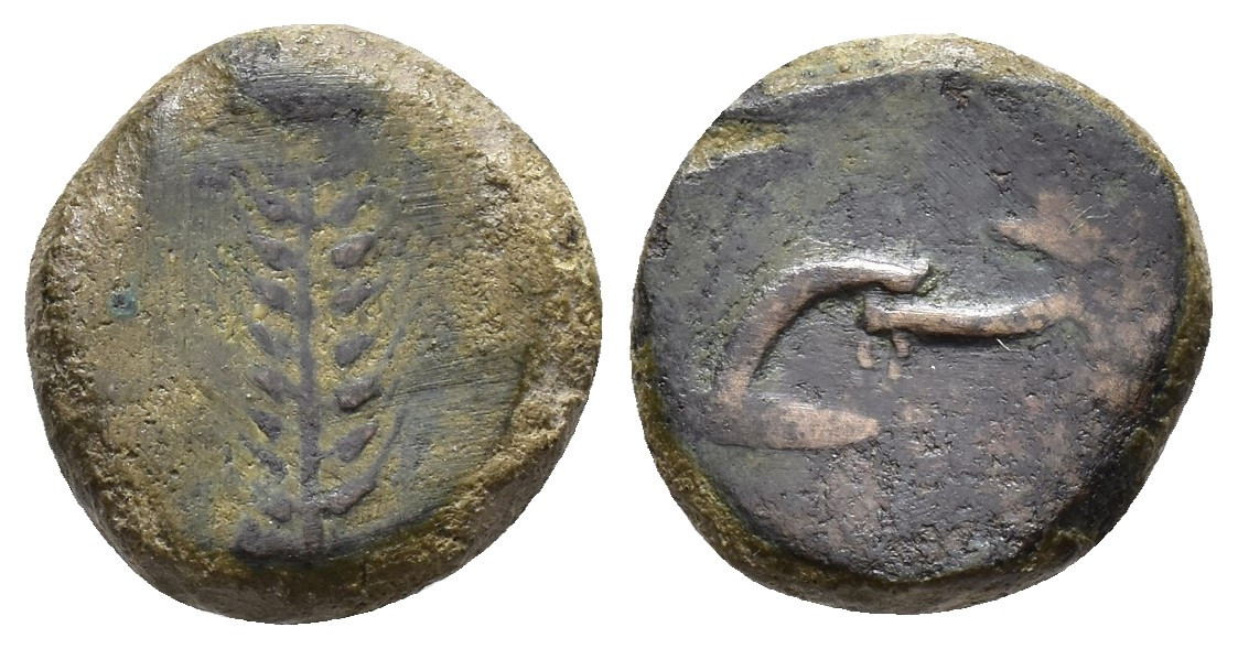HISPANIA ANTIGUA. ILIPA. Cuadrante. A/ Espiga. R/ Arado. AE 3,21 g. 15,2 mm. I-1547; ACIP-2344; CC-2363, mismo ejemplar. BC+/MBC-. Rarísima.