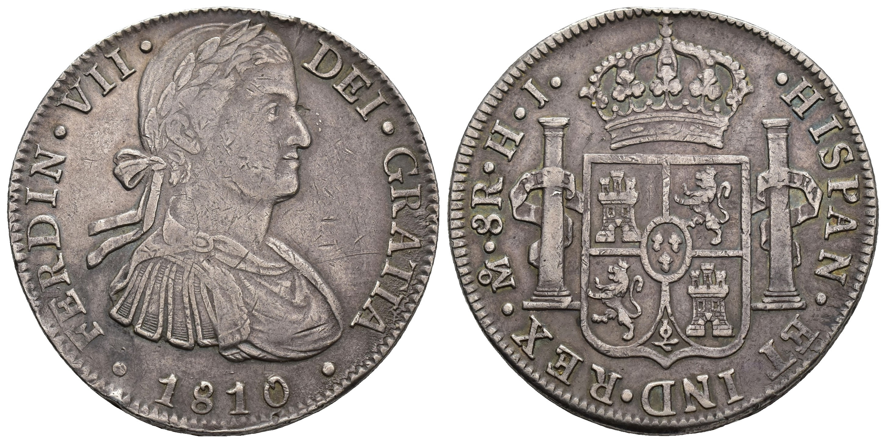 FERNANDO VII. 8 reales. 1810. México. HJ. AR 26,9 g. 39,1 mm. VI-1086; AC-1314. Golpecitos. MBC.