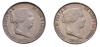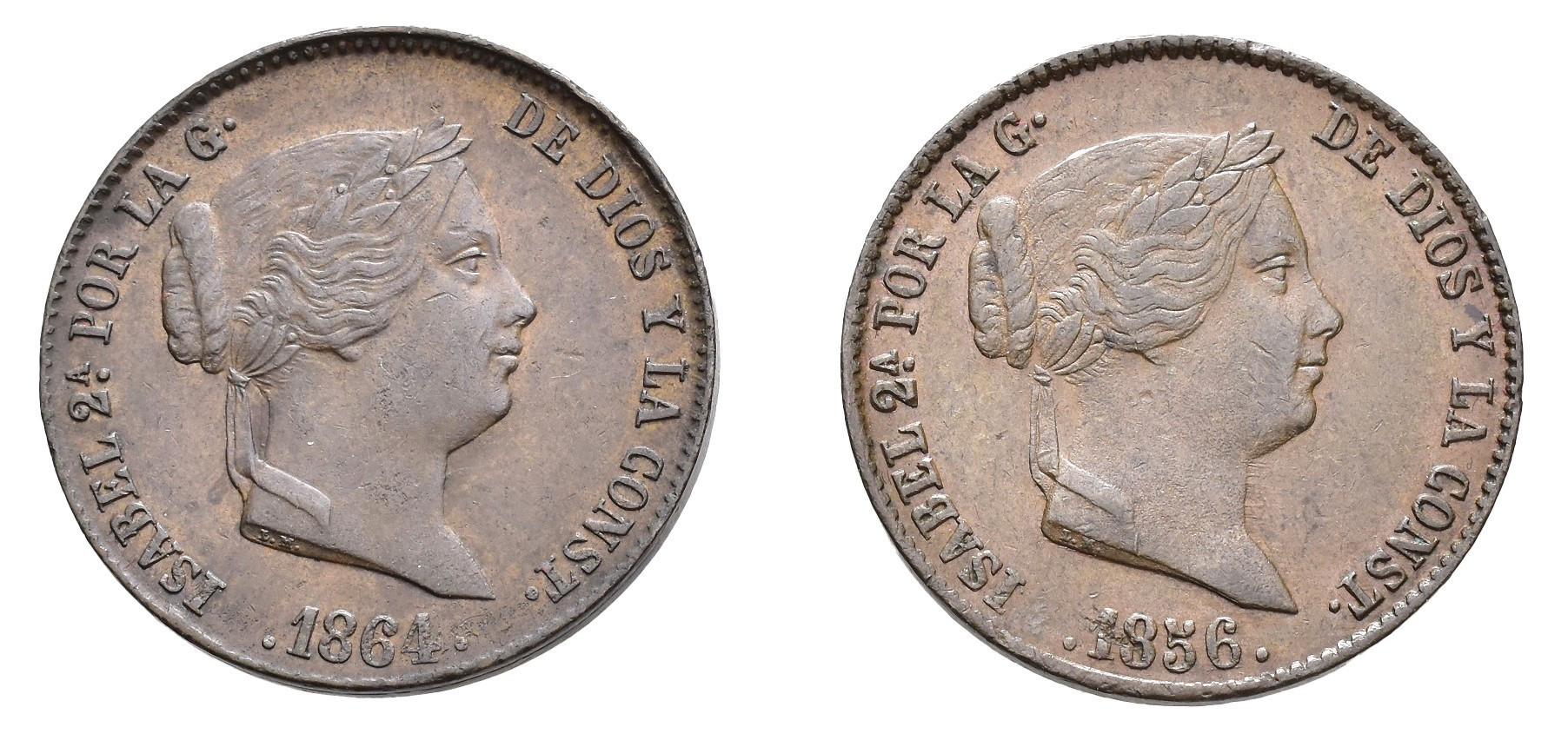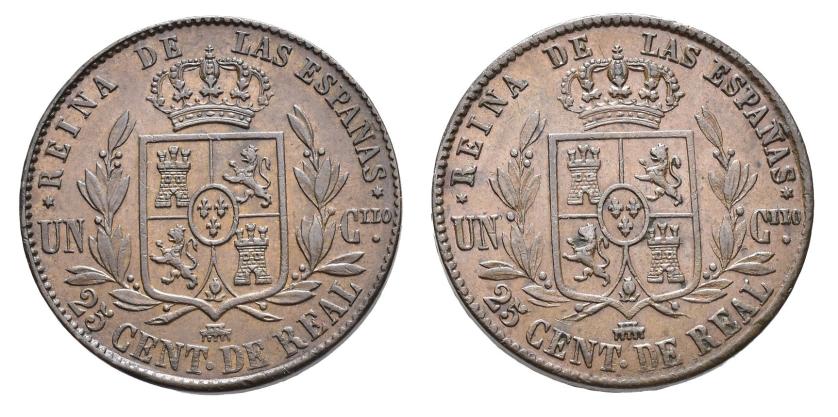 ISABEL II. Lote de 2 piezas de25 céntimos de real, Segovia, 1856 y 1864. MBC+/EBC-.