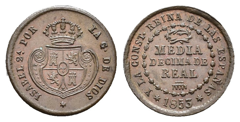 ISABEL II. 1/2 décima de real. 1853. Segovia. CU 2,03 g. 15,7 mm. VI-104; AC-140, R.B.O. EBC.