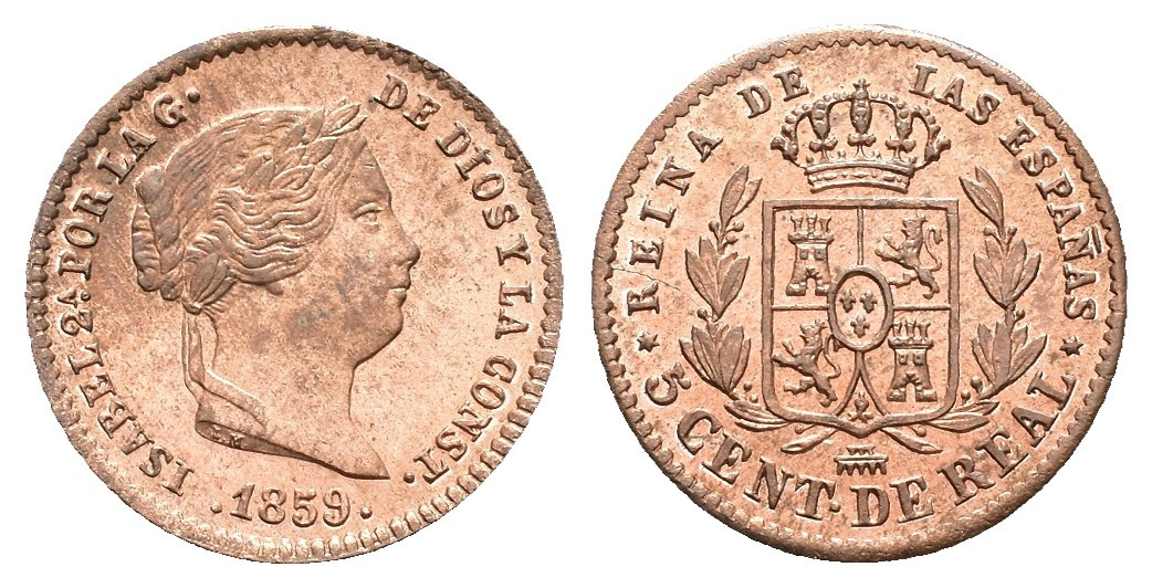 ISABEL II. 5 céntimos de real. 1859. Segovia. CU 1,7 g. 17,09 mm. VI-125; AC-164. Pleno B.O. SC.