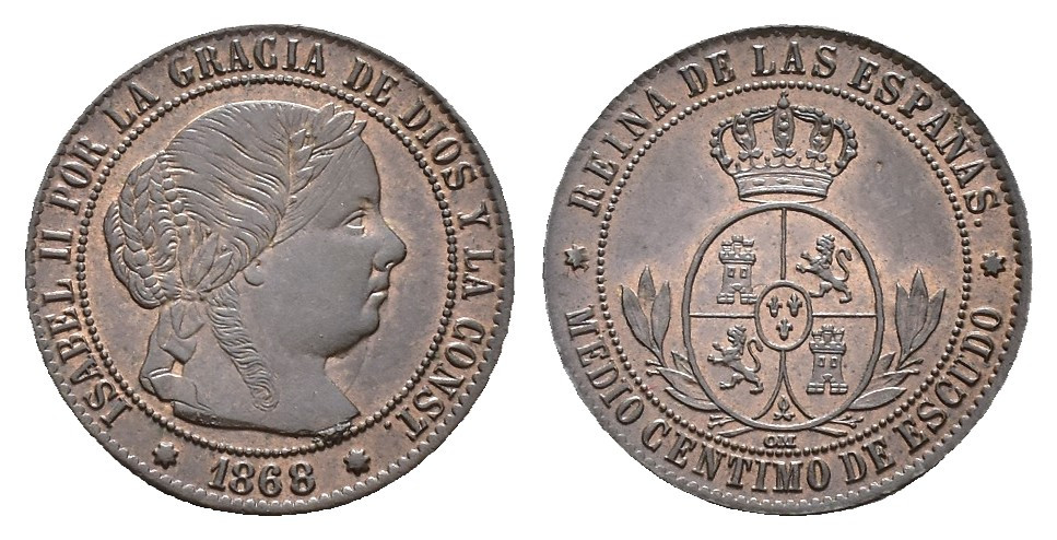ISABEL II. 1/2 céntimo de escudo. 1868. Sevilla. OM. CU 1,24 g. 15,8 mm. VI-167; AC-212. R.B.O. EBC-.