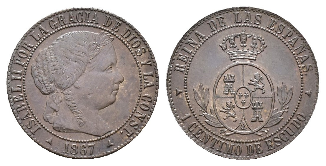 ISABEL II. Céntimo de escudo. 1867. Segovia. OM. CU 2,51 g. 18,1 mm. VI-178; AC-225. Pequeñas marcas. EBC-.