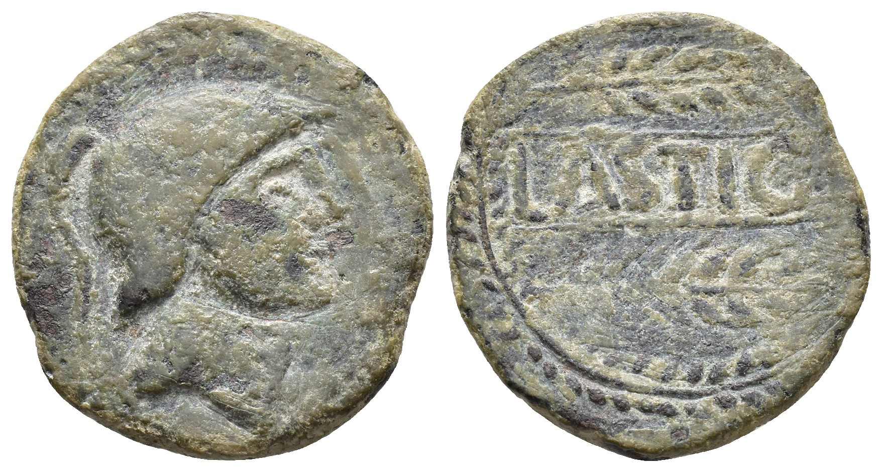 HISPANIA ANTIGUA. LASTIGI. Semis. A/ Cabeza con casco a der. R/ Dos espigas a der., en medio entre líneas LASTIGI. AE 6,46 g. 25,2 mm. I-no; ACIP-2372 var.; CC-3289, mismo ejemplar. Pátina verde con erosiones. BC+/MBC-. Rara.