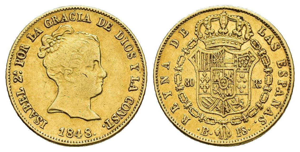 ISABEL II. 80 reales. 1848. Barcelona. PS. AU 6,72 g. 20,9 mm. VI-591; AC-717. Rayita en anv. MBC/MBC+. Rara.