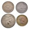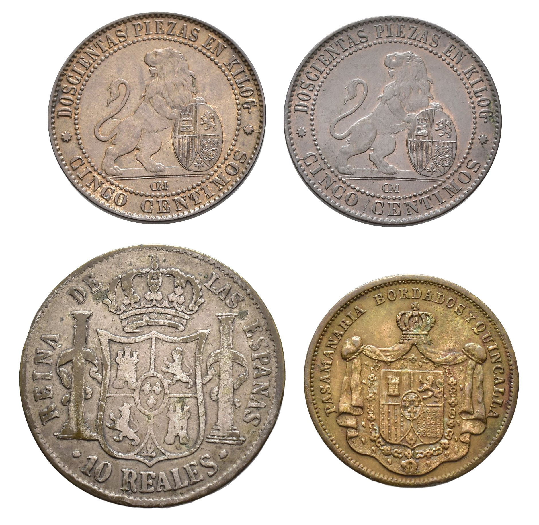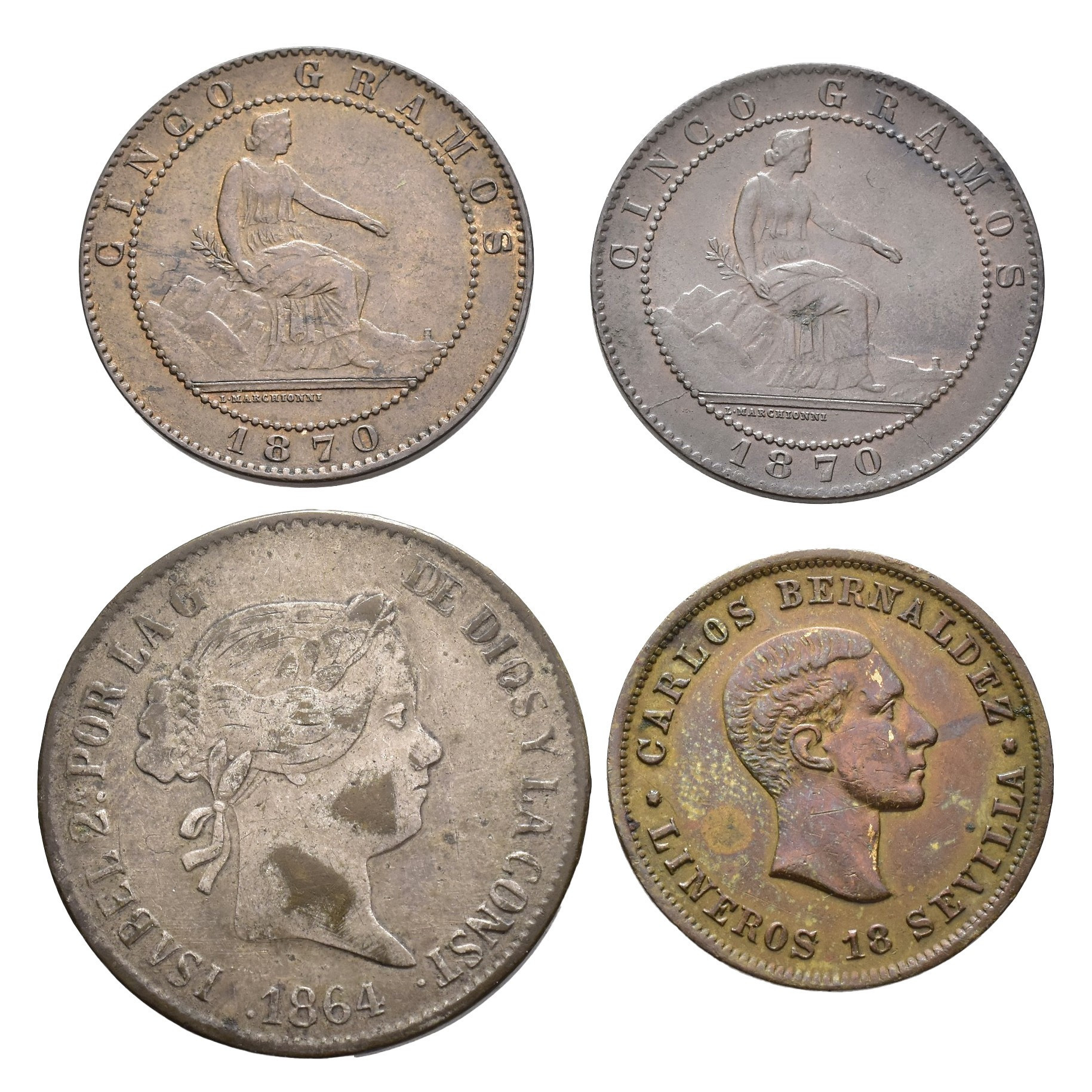 GOBIERNO PROVISIONAL. Lote de 4 piezas: 10 reales Isabel II 1864 Madrid falsos de época en latón, 5 céntimos 1870 Barcelona (2) y 1 ficha publicitaria Carlos Bernáldez Sevilla. MBC-/EBC-.