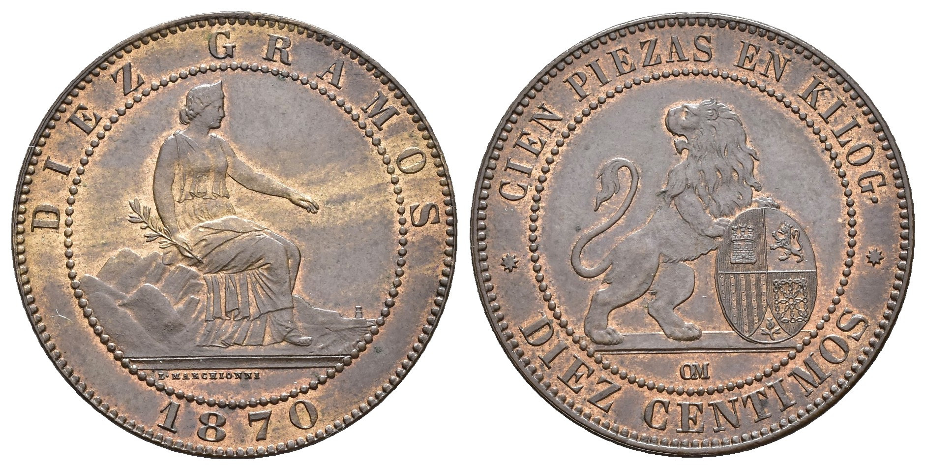 GOBIERNO PROVISIONAL. 10 céntimos. 1870. Barcelona. OM. CU 10,02 g. 30,1 mm. VI-6; AC-8. R.B.O. EBC.
