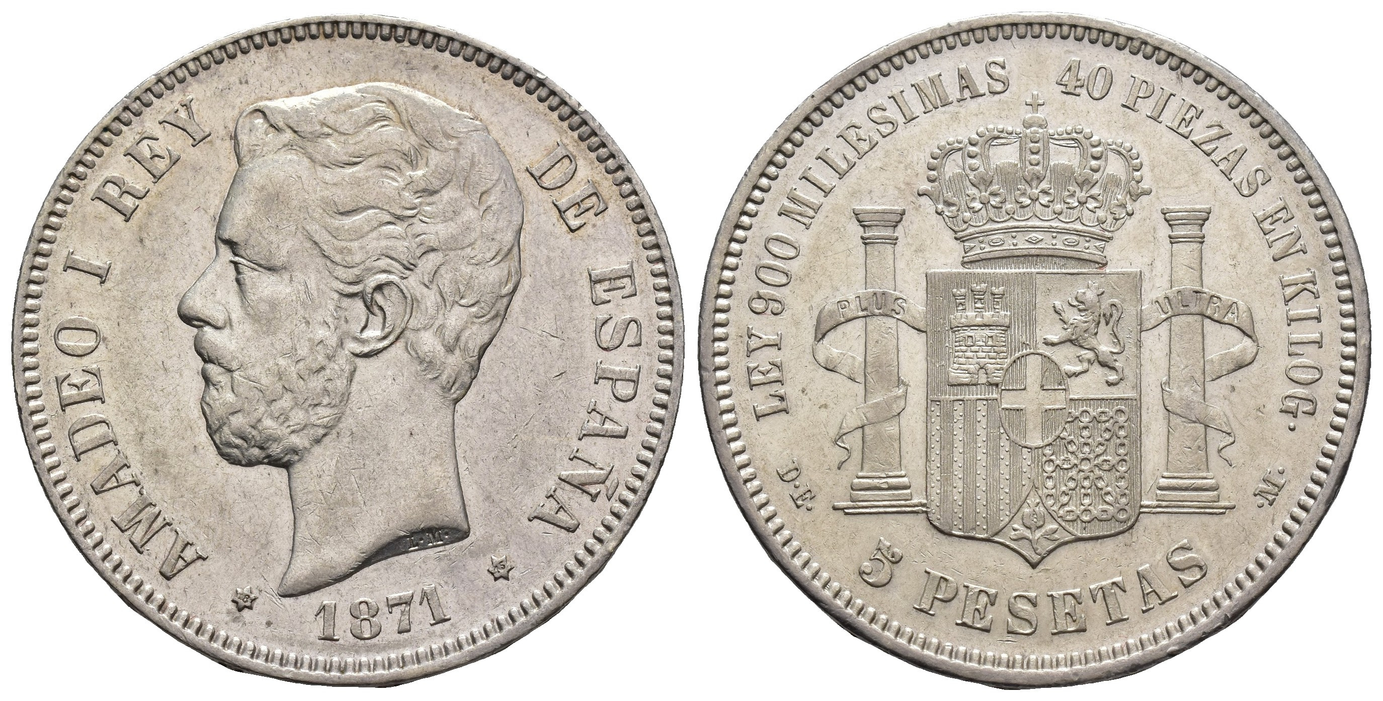 AMADEO I. 5 pesetas. 1871*18-75. Madrid. DEM. AR 25,03 g. 37,3 mm. VII-36; AC-7. Pequeñas marcas. EBC-.