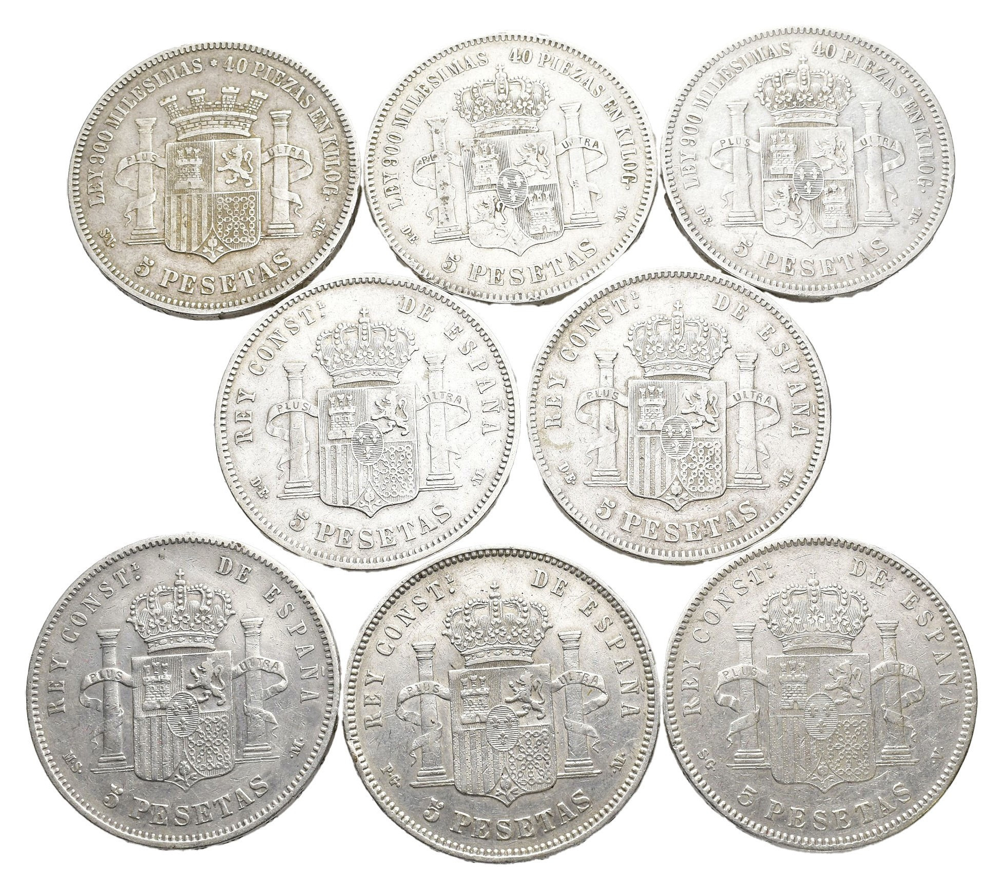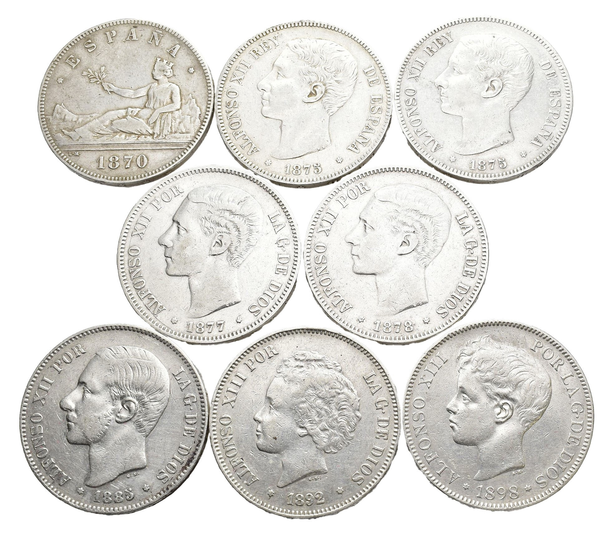ALFONSO XII. Lote de 8 monedas de 5 pts.: 1870, 1875 (2), 1877, 1878, 1885, 1892 y 1898. MBC/MBC+.