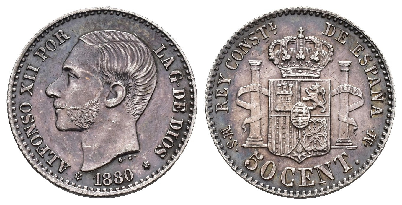 ALFONSO XII. 50 céntimos. 1880*80. Madrid. MSM. AR 2,5 g. 18,2 mm. VII-48; AC-11. Limpiada. EBC-