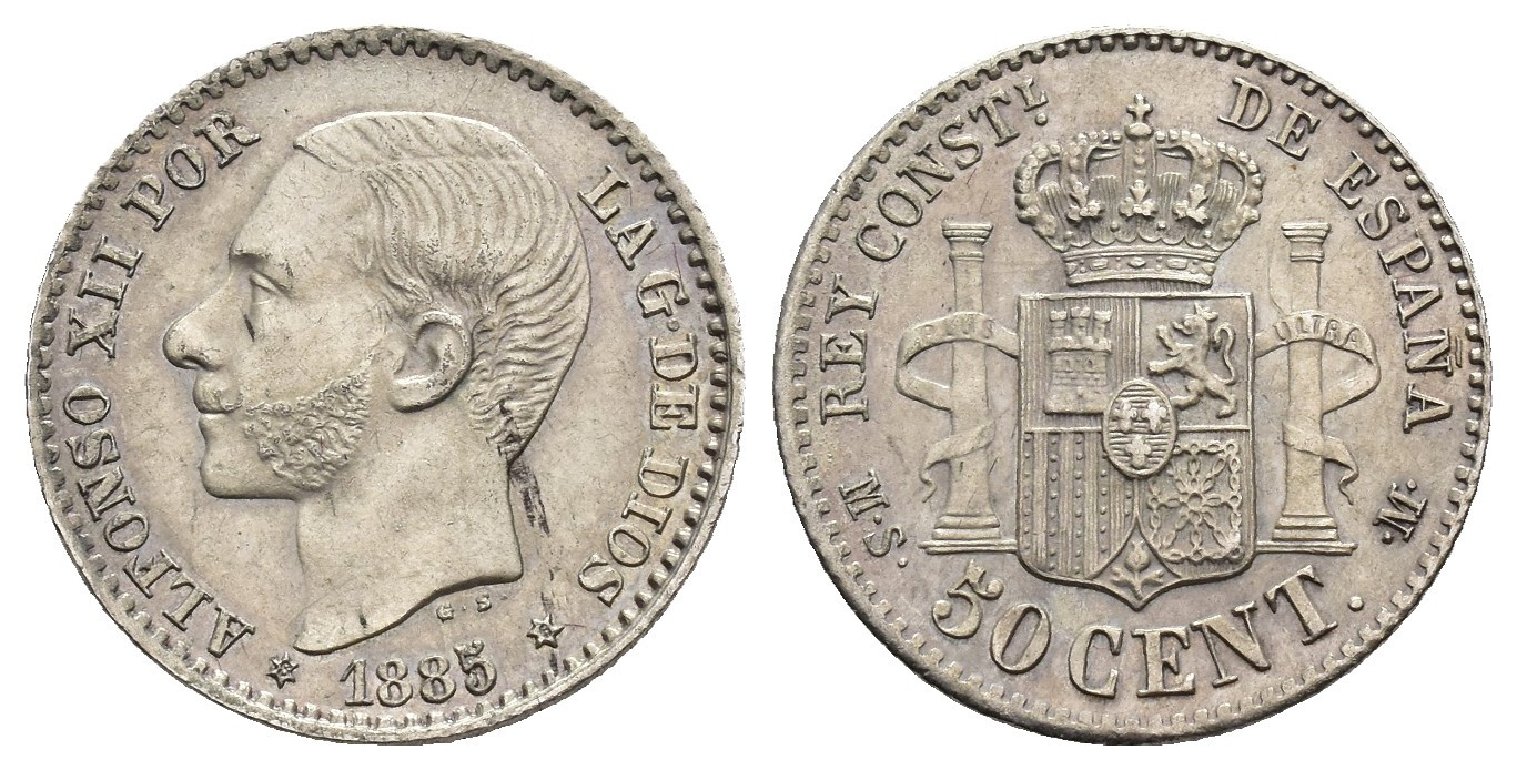 ALFONSO XII. 50 céntimos. 1885/1*8-6.. Madrid. MSM. AR 2,48 g. 18,3 mm. VII-50.1; AC-13. EBC-.