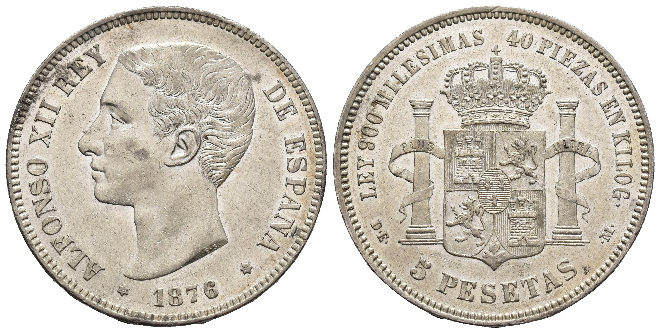 ALFONSO XII. 5 pesetas. 1876*18-76. Madrid. DEM. AR 25,12 g. 37,4 mm. VII-82; AC-37. R.B.O. EBC-.