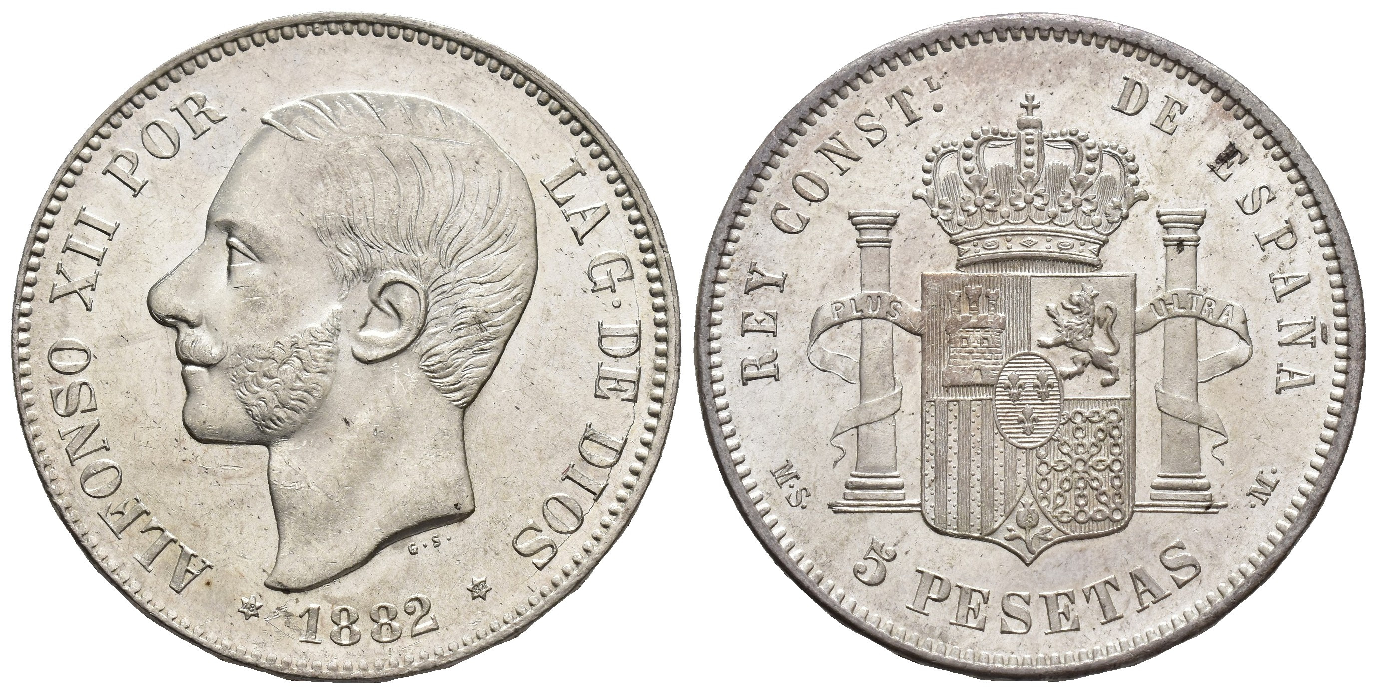 ALFONSO XII. 5 pesetas. 1882*18-82 Madrid. MSM. AR 25,07 g. 37,6 mm. VII-88; AC-51. Pequeñas marcas. Pleno B.O. SC.