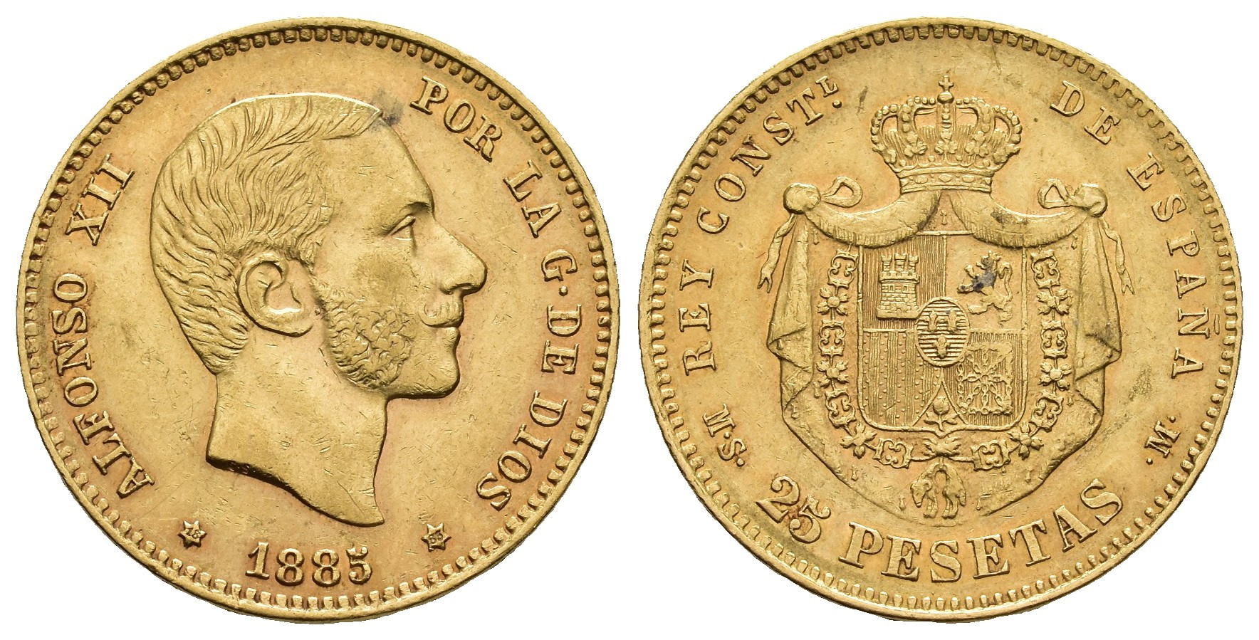 ALFONSO XII. 25 pesetas. 1885*18-85. Madrid. MSM. AU 8,07 g. 9,6 mm. VII-114; AC-90. MBC+. Rara.
