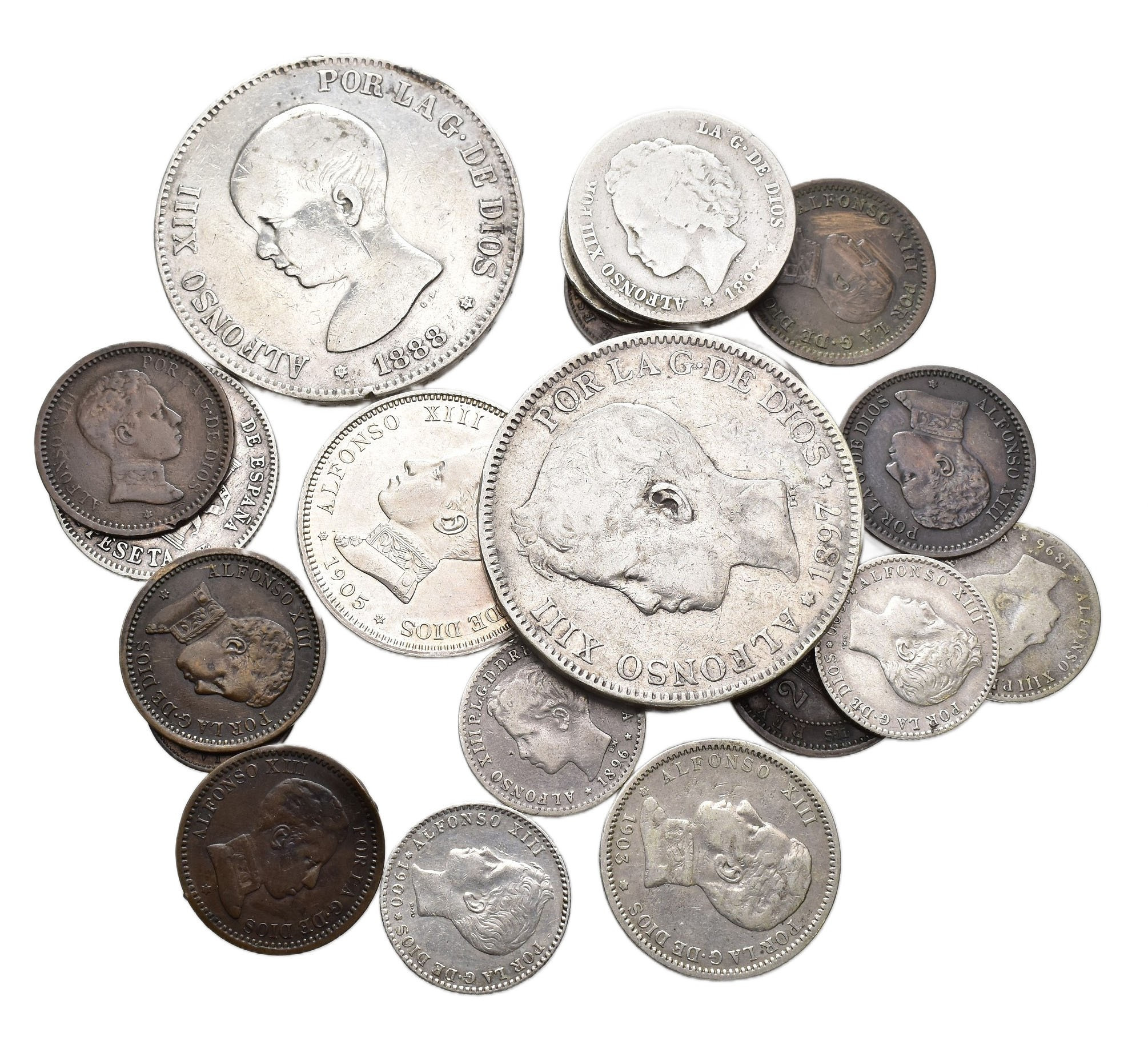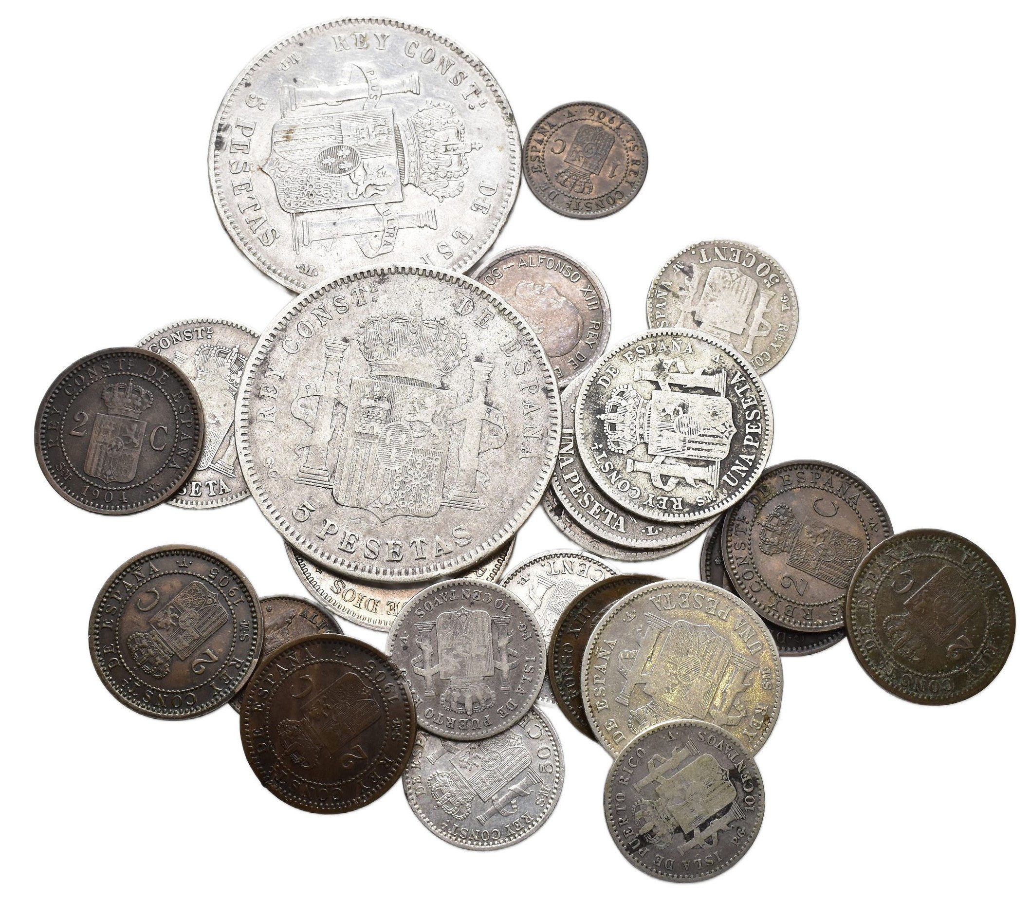 ALFONSO XIII. Lote de 23 monedas: 1 céntimo (2), 2 céntimos (7), 50 cts. (4), 10 cvs. de peso de Puerto Rico (2). 1 peseta (5), 2 pts. (1) y 5 pts. (2). BC+/EBC.