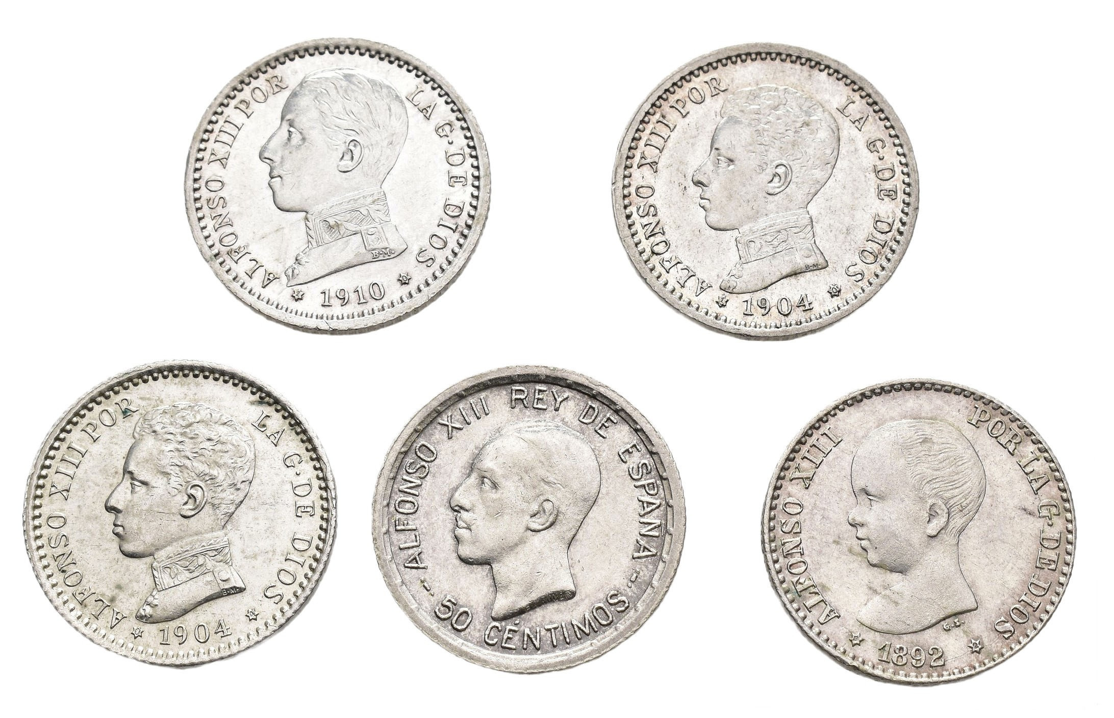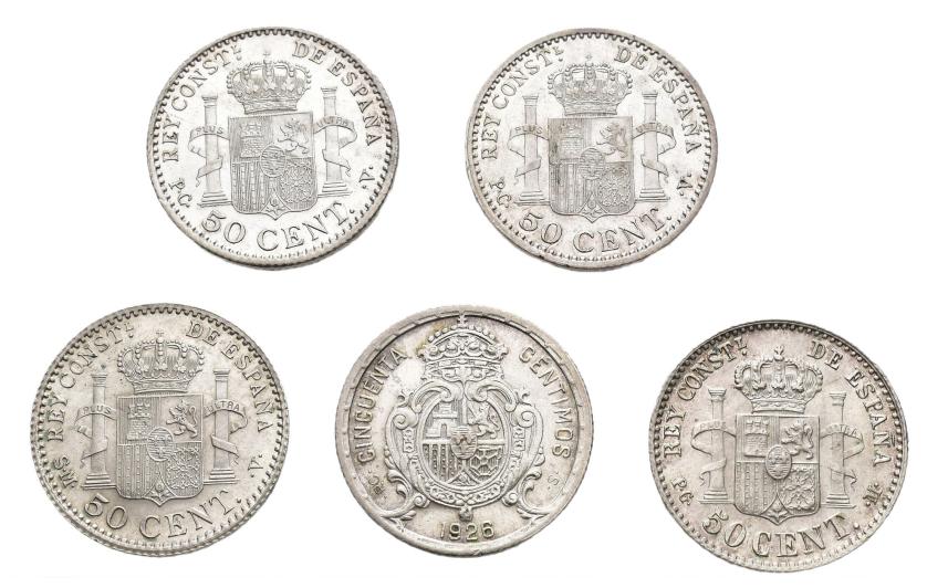 ALFONSO XIII. Lote de 5 piezas de 50 céntimos Madrid: 1892*9-2, 1904*0-4, 1904*1-0, 1910*1-0 y 1926. EBC-/EBC.