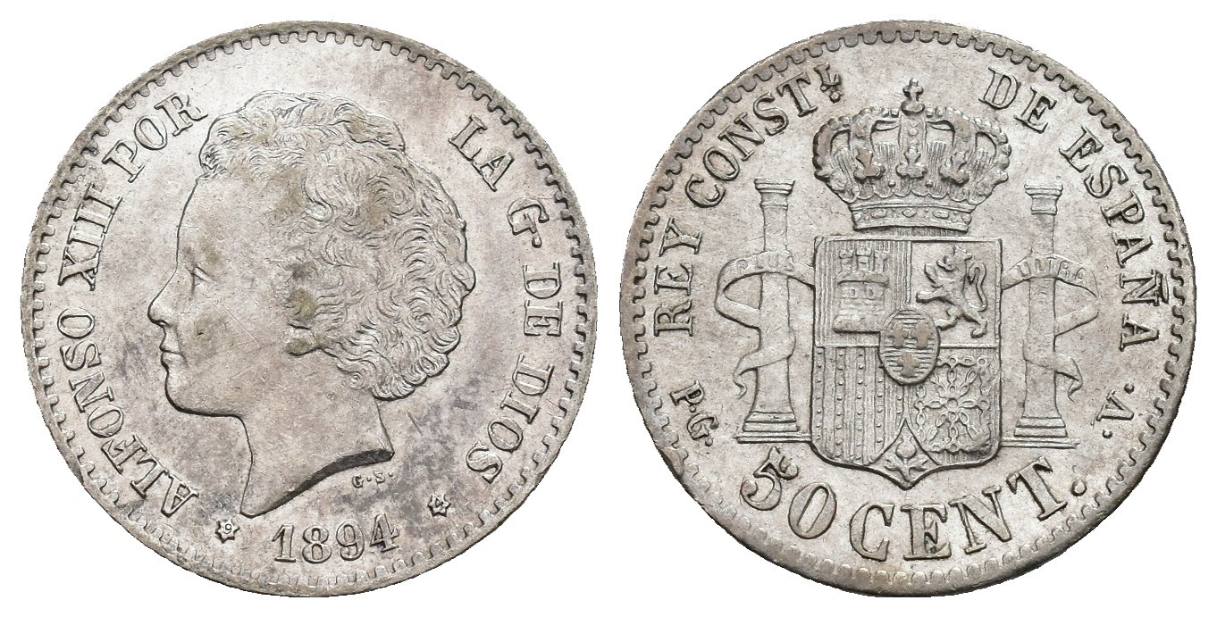 ALFONSO XIII. 50 céntimos. 1894. Madrid. PGV. AR 2,51 g. 18,1 mm. VII-142; AC-43. MBC+.