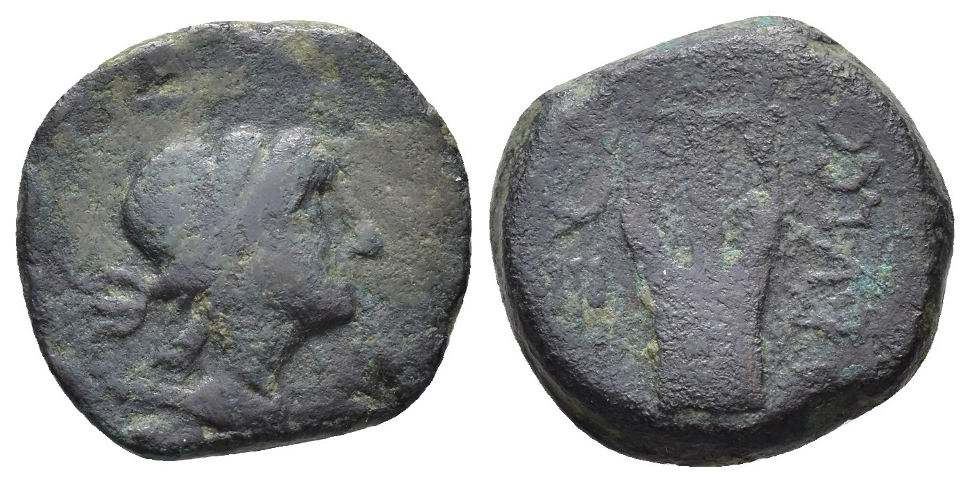 HISPANIA ANTIGUA. OBULCO. Semis. A/ Cabeza femenina a der. R/ Lira, a izq. creciente y IIII, a der. ley. (O)BVLCO. AE 5,37 g. 17,7 mm. I-1852. ACIP-2251. BC+. Muy rara.