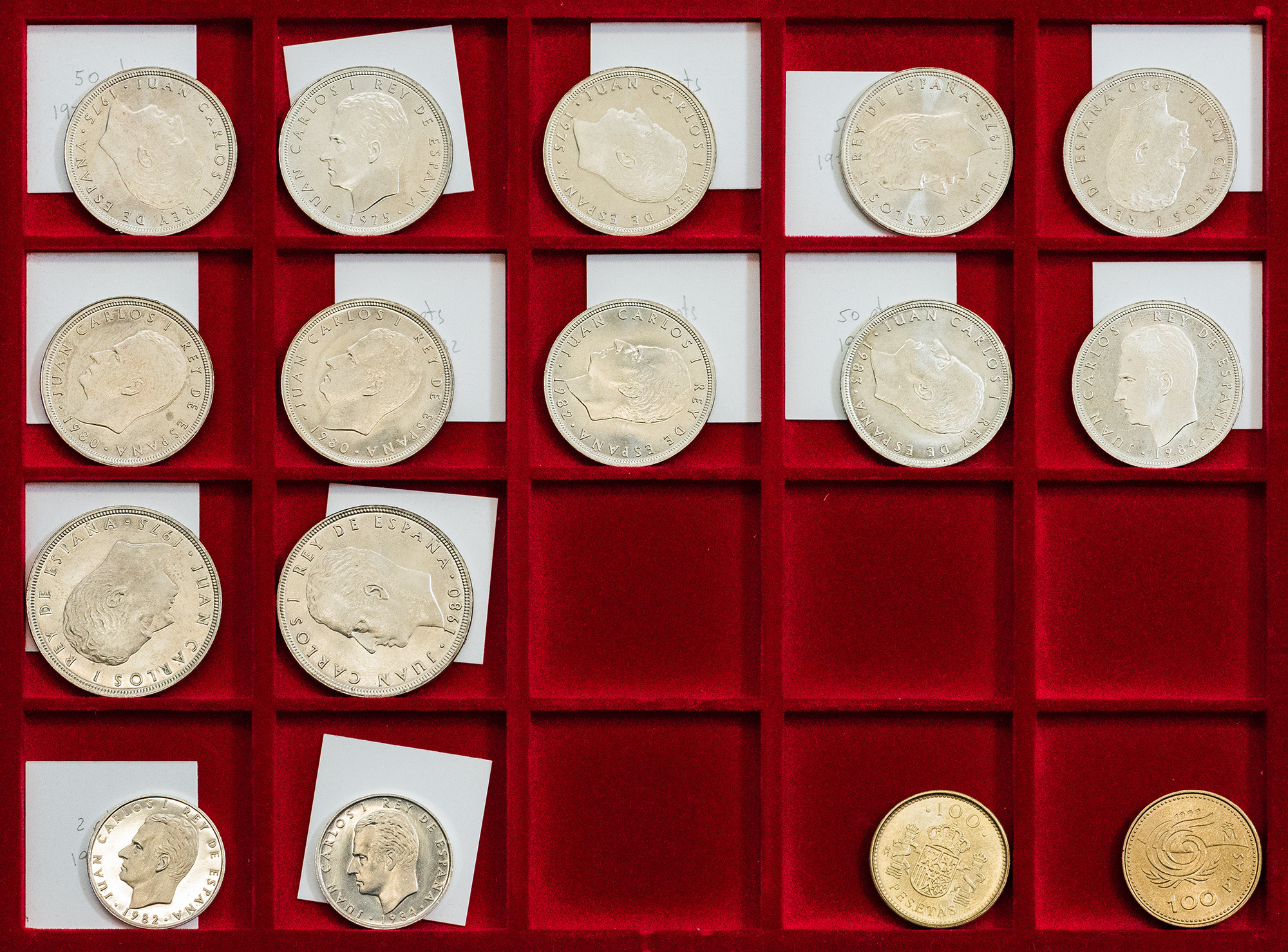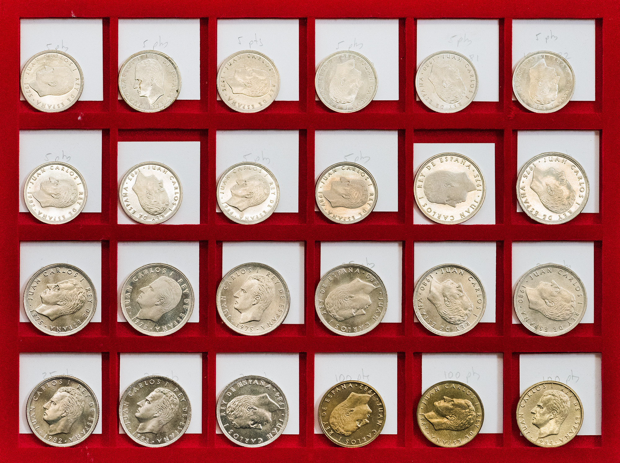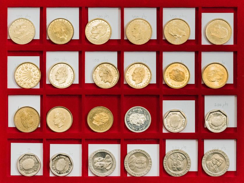 JUAN CARLOS I. Colección de monedas desde 50 céntimos a 500 pts. Destacando error del Mundial, pareja E-87, serie en plata de la última emisión de la Peseta… Total 181 piezas. EBC/Prueba.