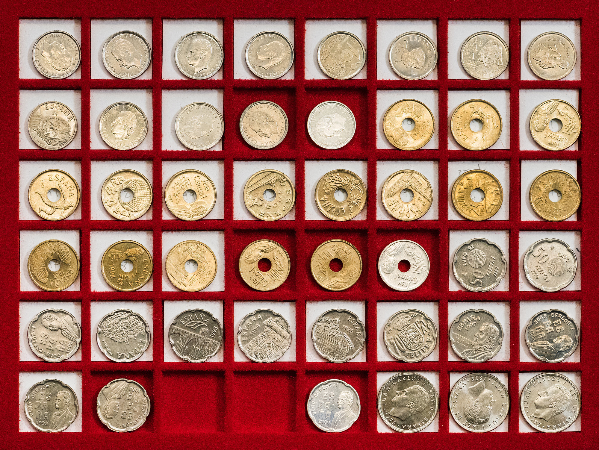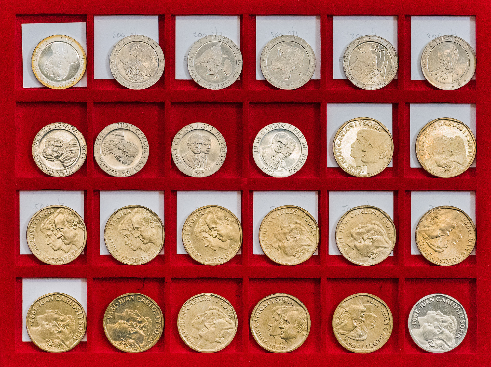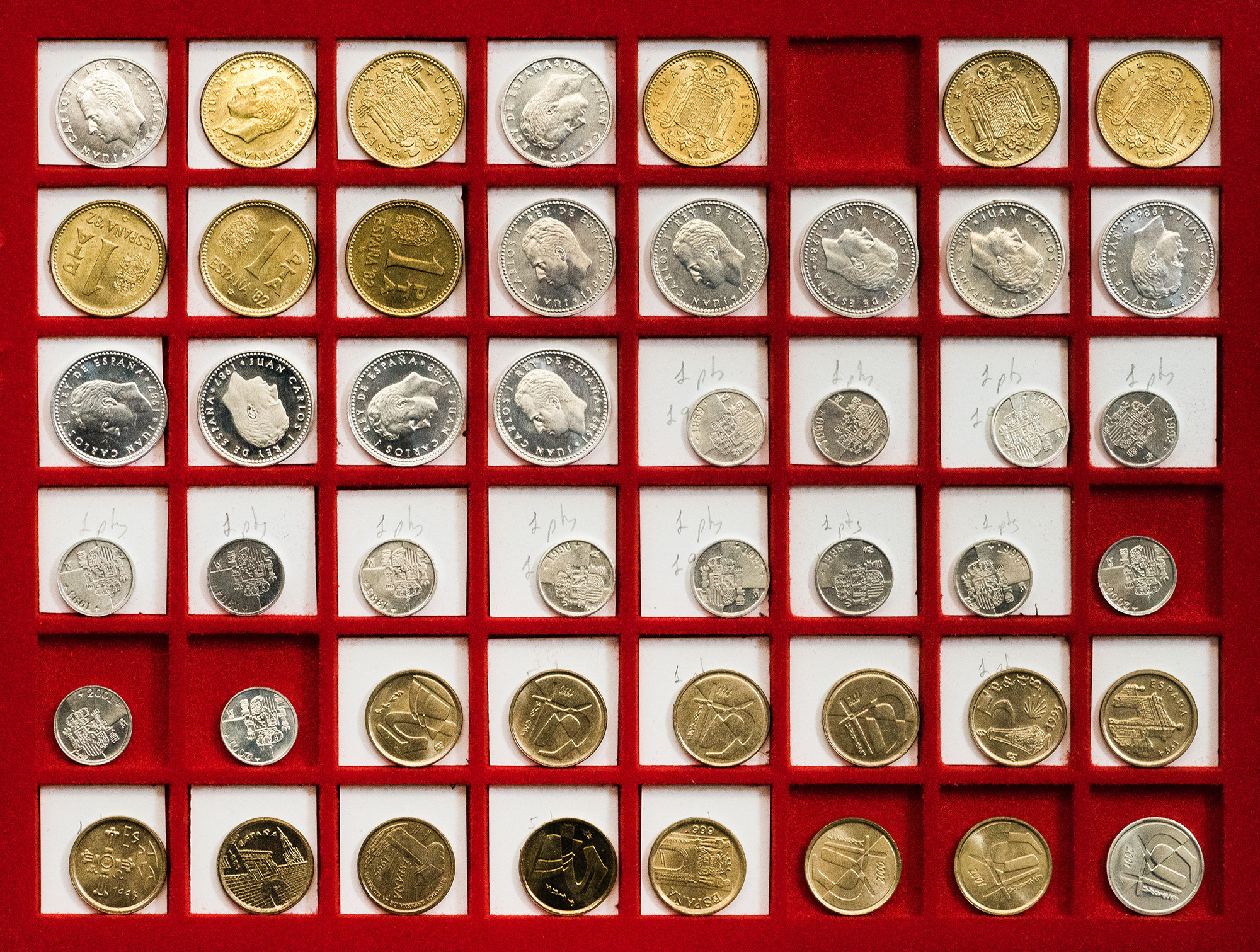 JUAN CARLOS I. Colección de monedas desde 50 céntimos a 500 pts. Destacando error del Mundial, pareja E-87, serie en plata de la última emisión de la Peseta… Total 181 piezas. EBC/Prueba.