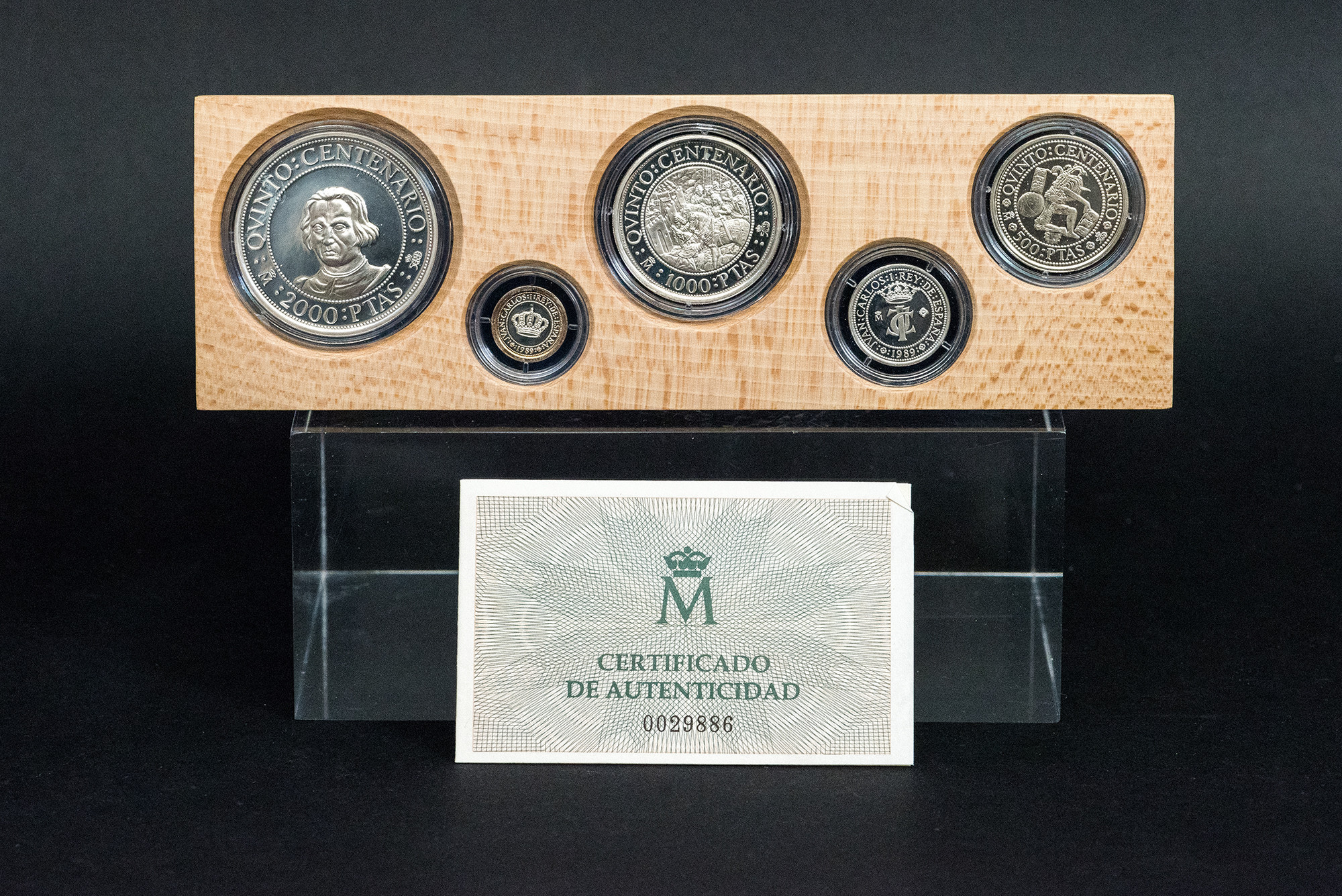 JUAN CARLOS I. Estuche FNMT. V Centenario. 1989. 5 valores: 100, 200, 500, 1000 y 2000 pts. En su caja y con certificado. FDC.