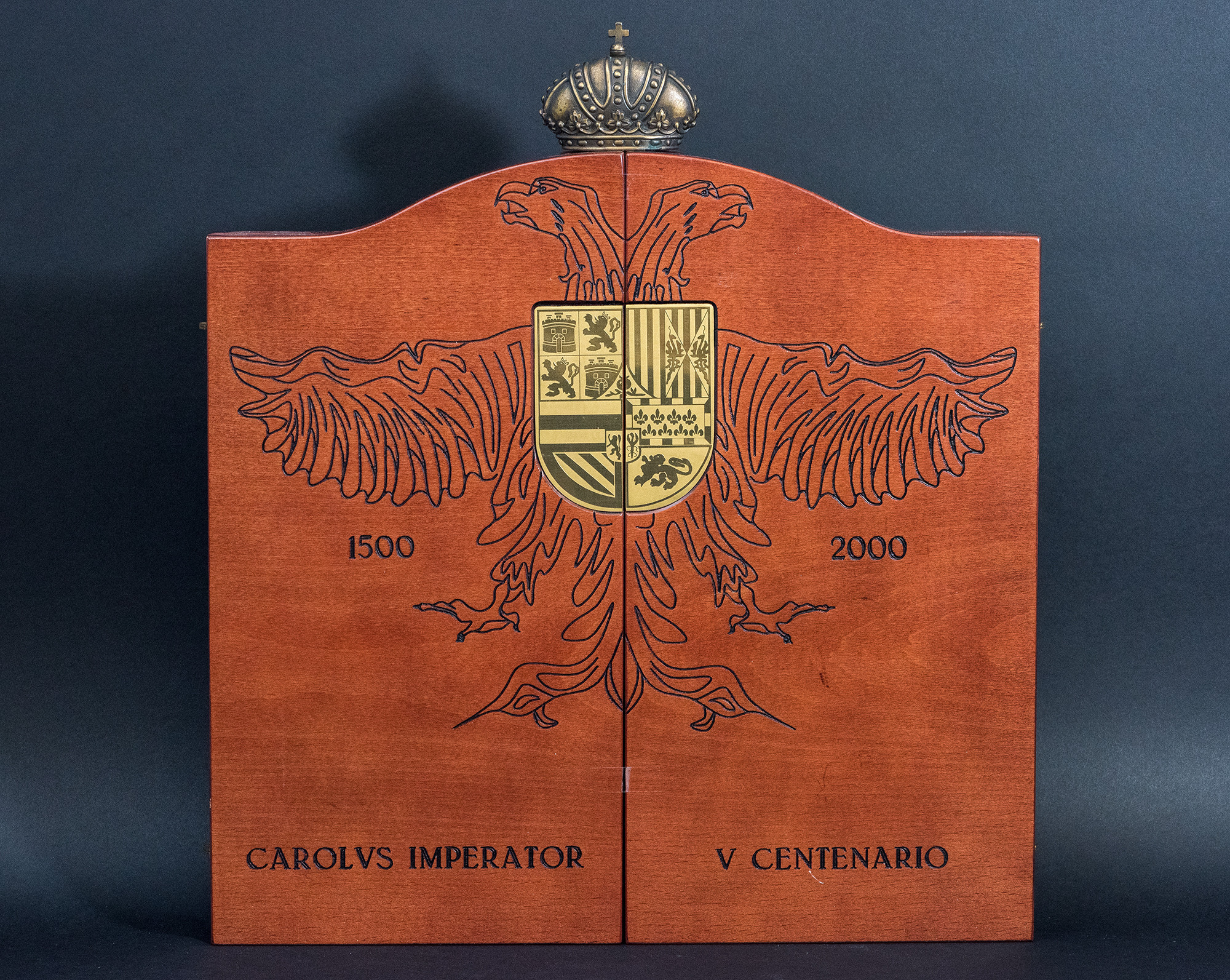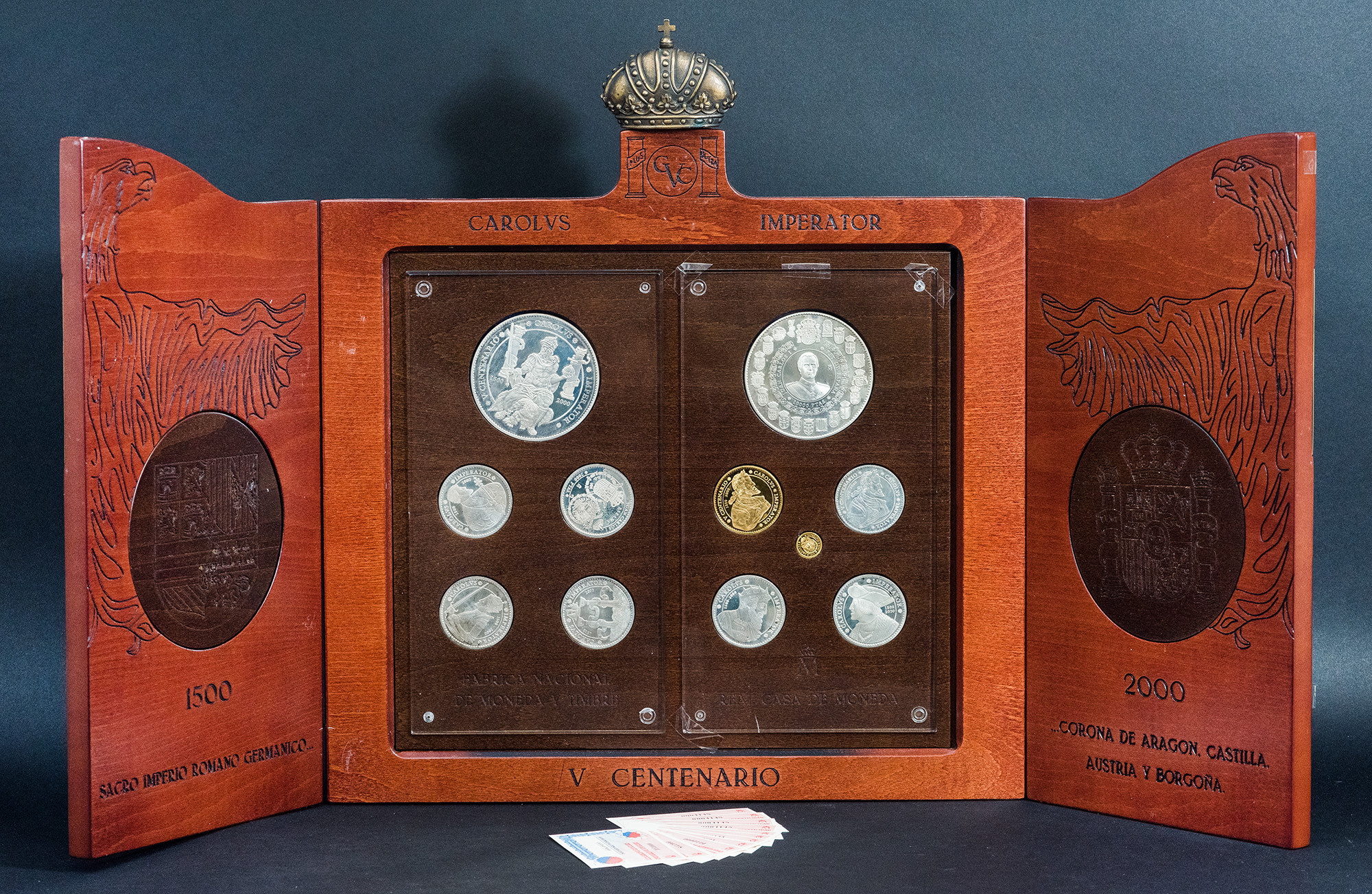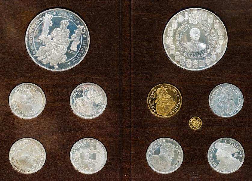 JUAN CARLOS I. Estuche FNMT conmemorativo V Centenario de Carlos V. 11 piezas: 40.000 pts. (AU 15,55 g); 1/2 escudo (AU 1,68 g), 2 cincuentines (AR 168,75 g); 2.000 pts. (6: AR 33,62 g) y 1.000 pts. (AR 13 g). En estuche expositor de madera y con certificados. Prueba.