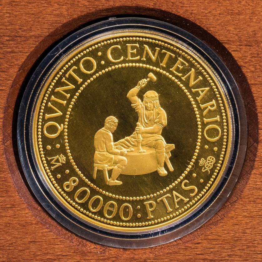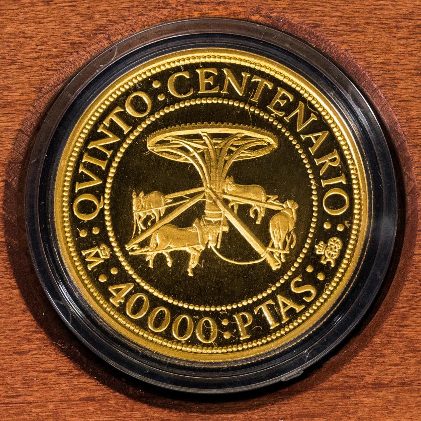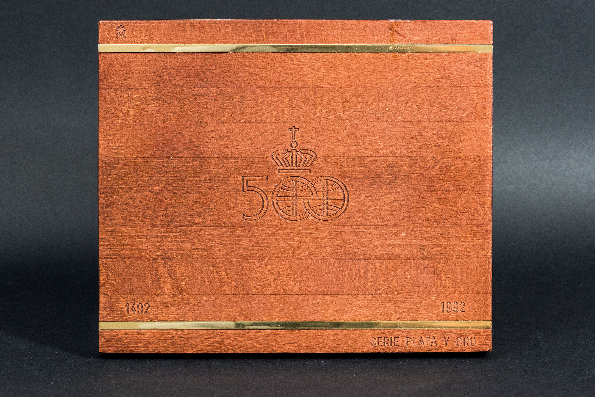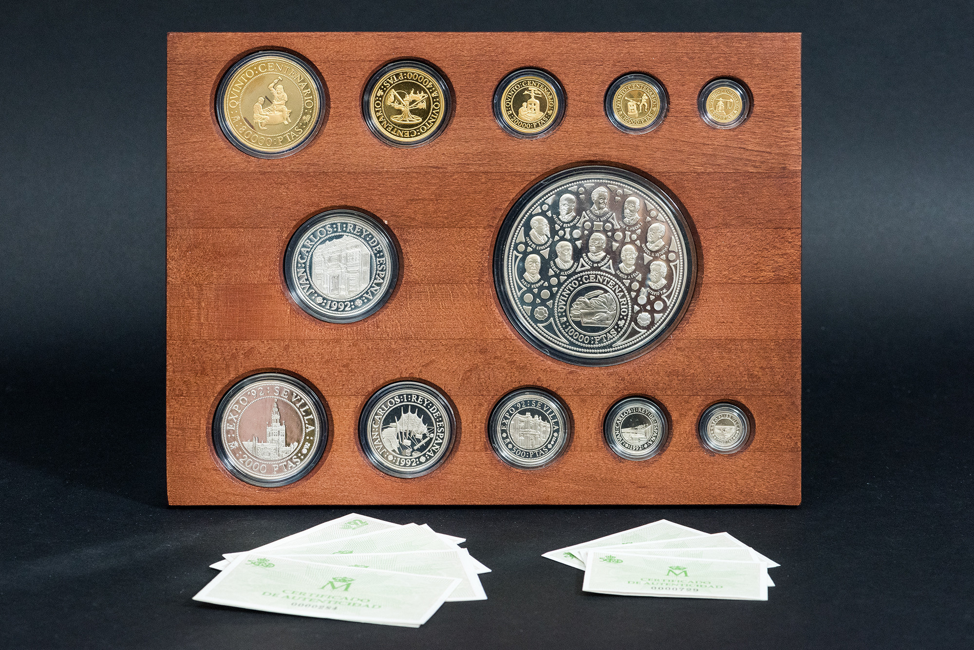 JUAN CARLOS I. Estuche FNMT. V Centenario. 1992. Serie IV. 5 monedas de oro: 80000 pts. (AU 27 g); 40000 pts. (AU 13,5 g); 20000 pts. (AU 6,75 g); 10000pts. (AU 3,37 g y 5000 pts. (AU 1,68 g); 7 monedas de plata: 10000 pts. (AR 144,75 g), 5000 pts. (AR 54 g), 2000 pts. (AR 27 g), 1000 pts. (AR 13,5 g), 500 pts. (AR 6,75 g) 200 pts. (AR 3,37 g) y 100 pts. (AR 1,68 g). Total 12 piezas. En su estuche de madera y con certificados. FDC
