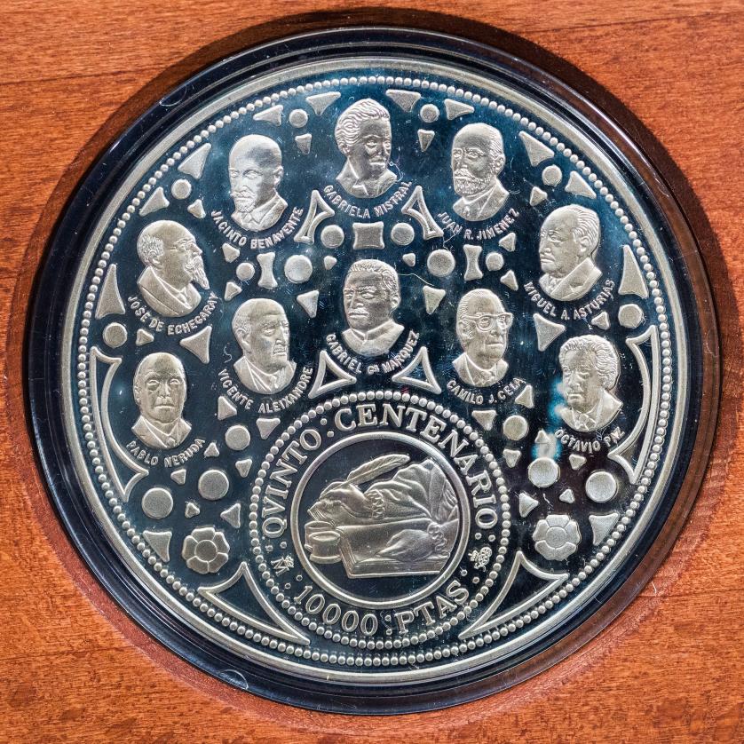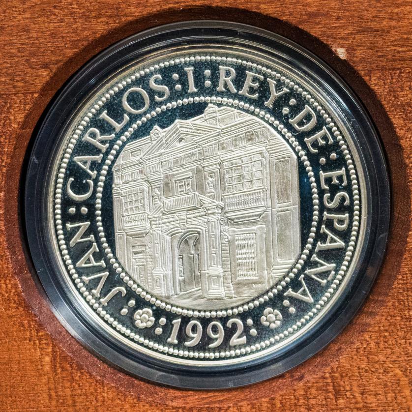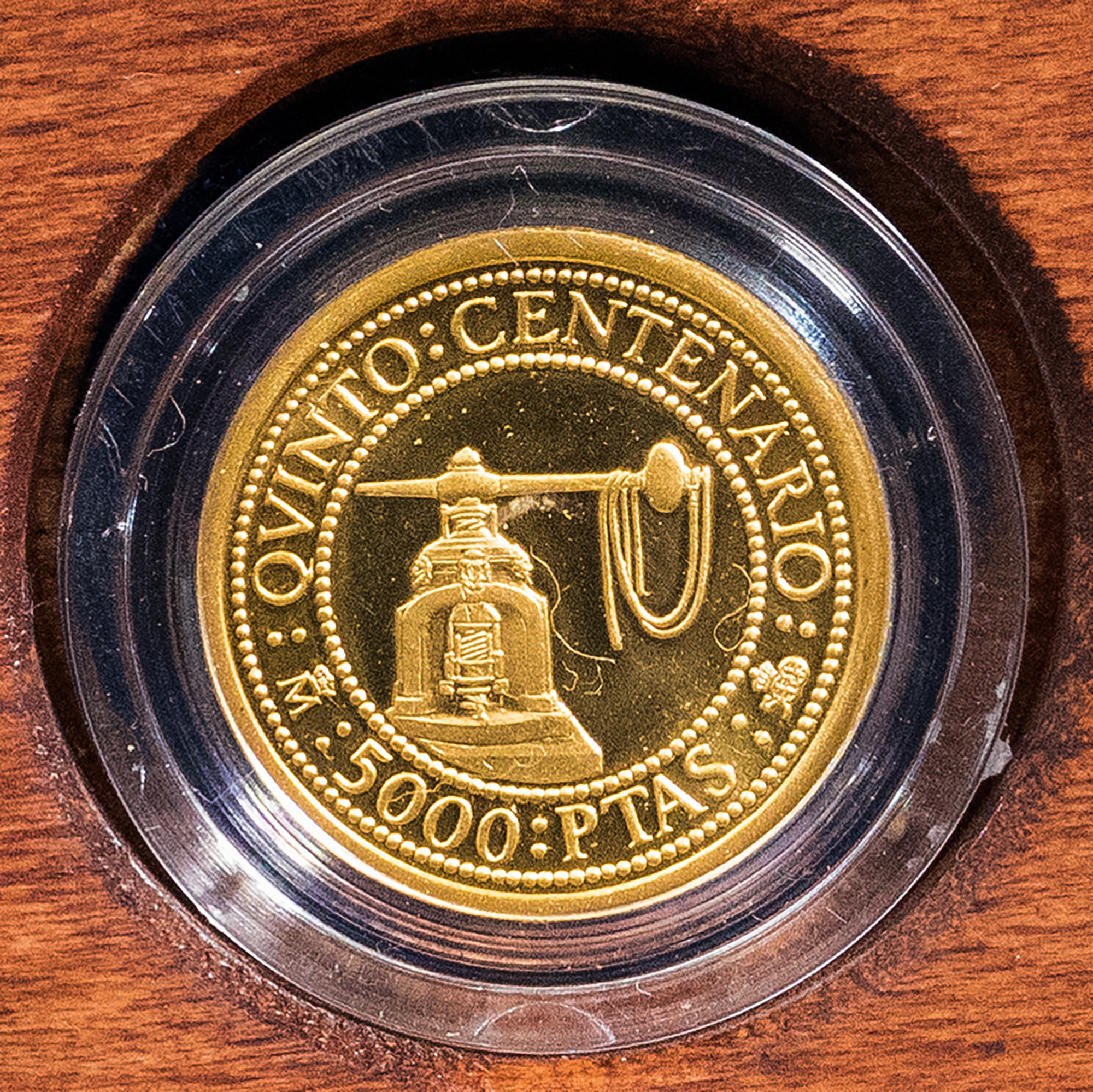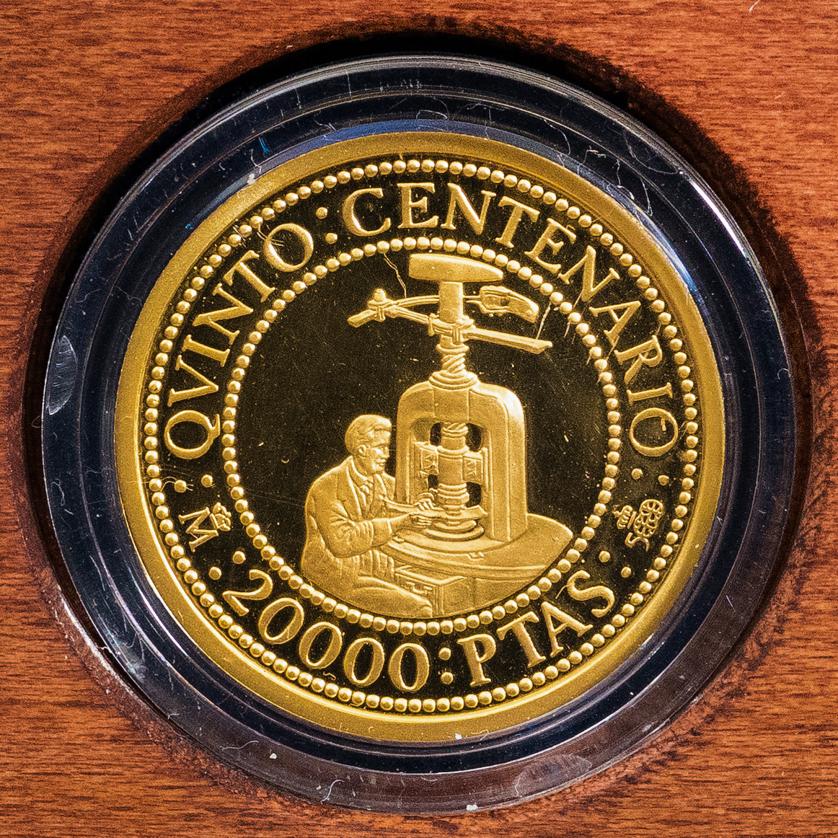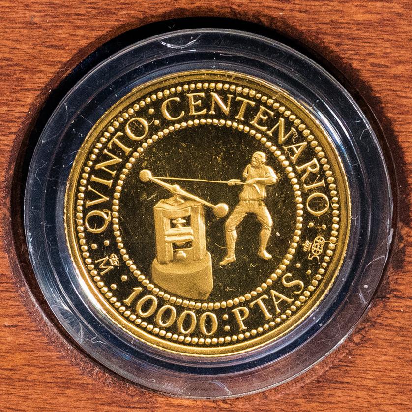 JUAN CARLOS I. Estuche FNMT. V Centenario. 1992. Serie IV. 5 monedas de oro: 80000 pts. (AU 27 g); 40000 pts. (AU 13,5 g); 20000 pts. (AU 6,75 g); 10000pts. (AU 3,37 g y 5000 pts. (AU 1,68 g); 7 monedas de plata: 10000 pts. (AR 144,75 g), 5000 pts. (AR 54 g), 2000 pts. (AR 27 g), 1000 pts. (AR 13,5 g), 500 pts. (AR 6,75 g) 200 pts. (AR 3,37 g) y 100 pts. (AR 1,68 g). Total 12 piezas. En su estuche de madera y con certificados. FDC