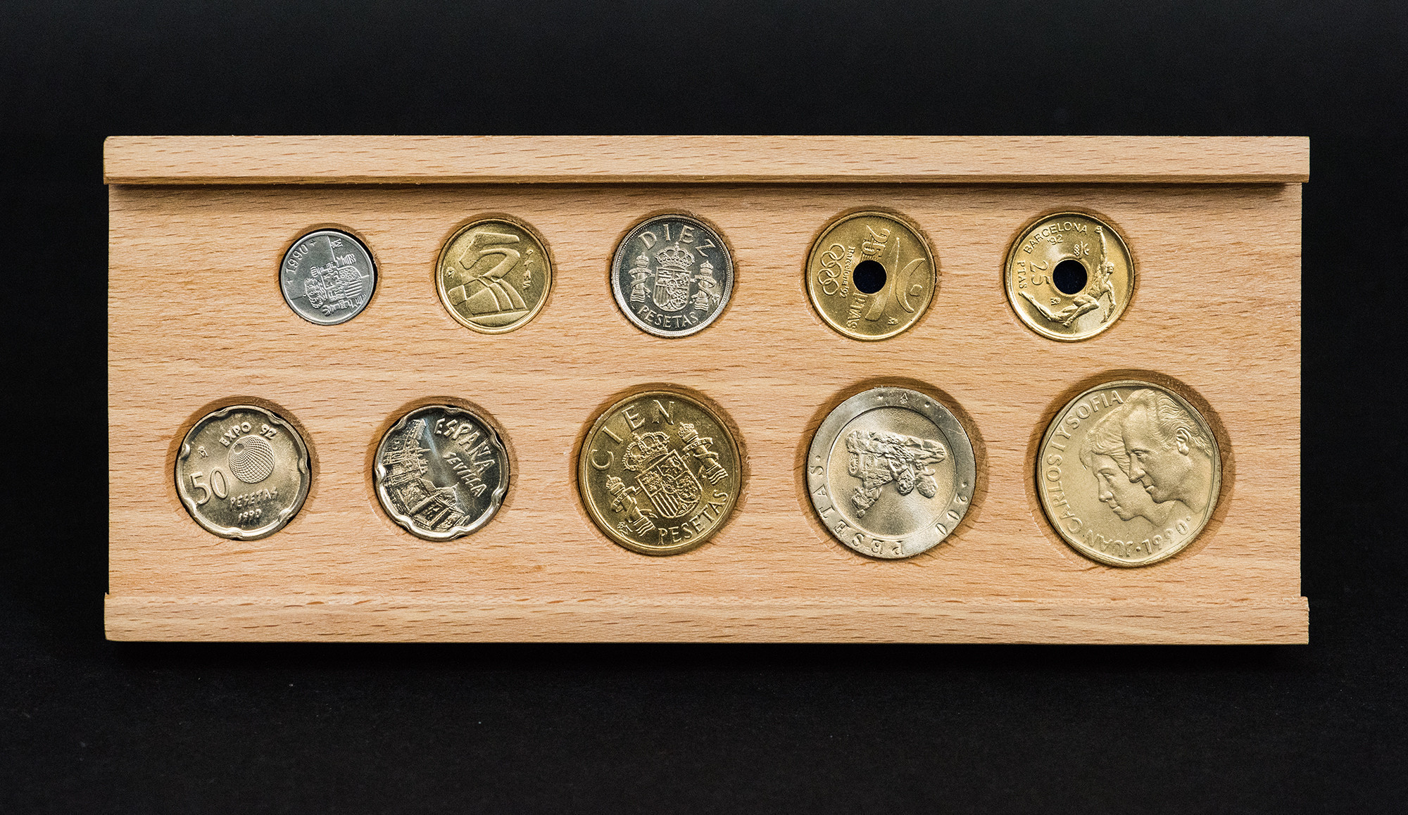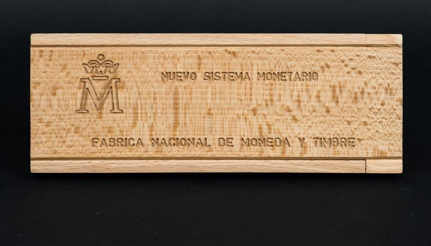 JUAN CARLOS I. Nuevo sistema monetario. 1990. Lote de 10 monedas: 1, 5, 10, 25 (2), 50 (2), 100, 200 y 500 pts. En caja de madera. SC.