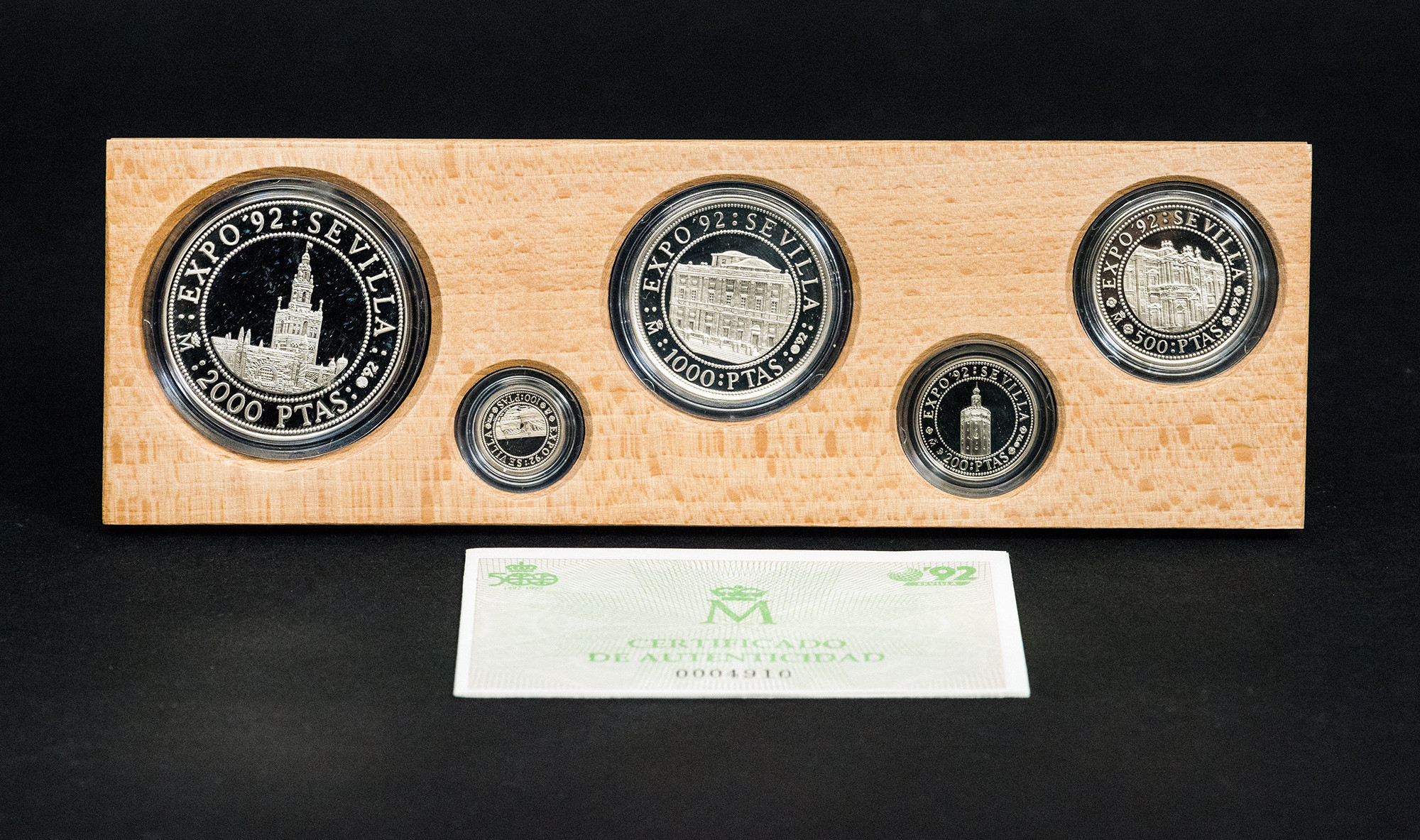 JUAN CARLOS I. "Expo de Sevilla" 1992, Serie IV. 100, 200, 500, 1000 y 2000 pts. En su estuche y con certificado. FDC.