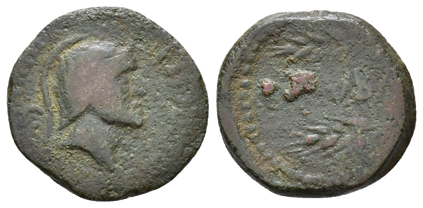 HISPANIA ANTIGUA. ONUBA. Semis. A/ Cabeza con casco a der.; (C AELI Q PVBLILI) apenas visible. R/ Dos espigas a izq.; O(N)VB(A). AE 4,59 g. 19,1 mm. I-1896; ACIP-2419. Pátina oscura. BC. Rara.