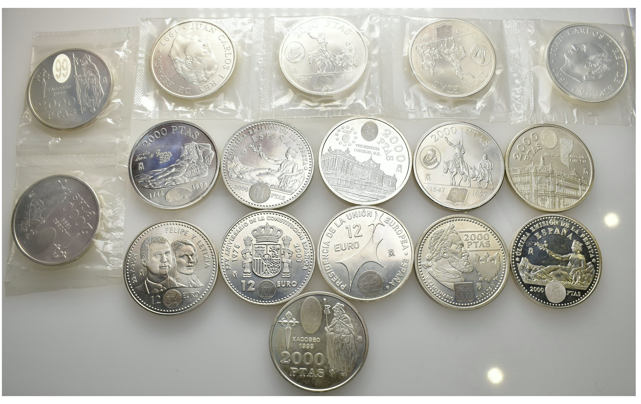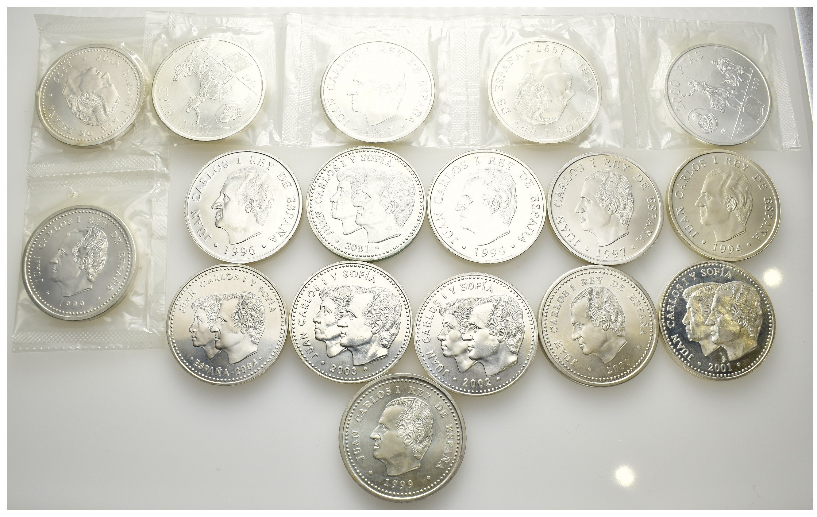JUAN CARLOS I. Lote de 17 monedas: 14 de 2000 pts. -1994, 1995, 1996, 1997 (5), 1999 (3), 2000 y 2001 (3)- y 3 de 12 euros 2002, 2003 y 2004. SC.