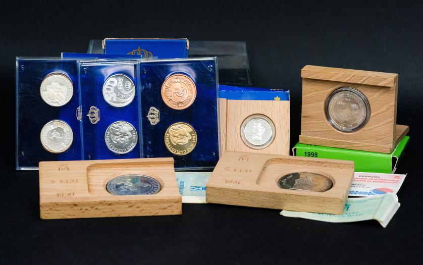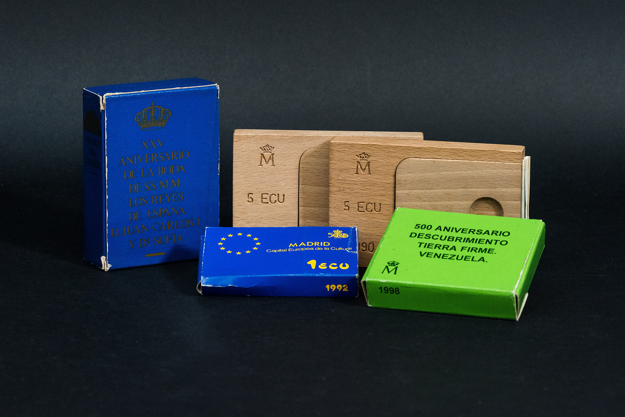 JUAN CARLOS I. Lote de 5 estuches FNMT:  estuche XXV Aniversario de boda de Juan Carlos y Sofía, 500 pts., 1987, con 5 monedas y 1 medalla conmemorativa de la Constitución de 1978, 2 de ellas en plata, y librito (total 6 piezas), pruebas de la FNMT,  prueba.; 1 Ecu, Madrid, Capital Europea de la Cultura, 1992, FDC; 3 euros AR: 500 Aniversario del Descubrimiento de Tierra Firme. Venezuela. 1998; 2 esuches de 5 ecu (AR 33 g): Averroes 1991 y Alfonso X el Sabio, 1990, FDC.