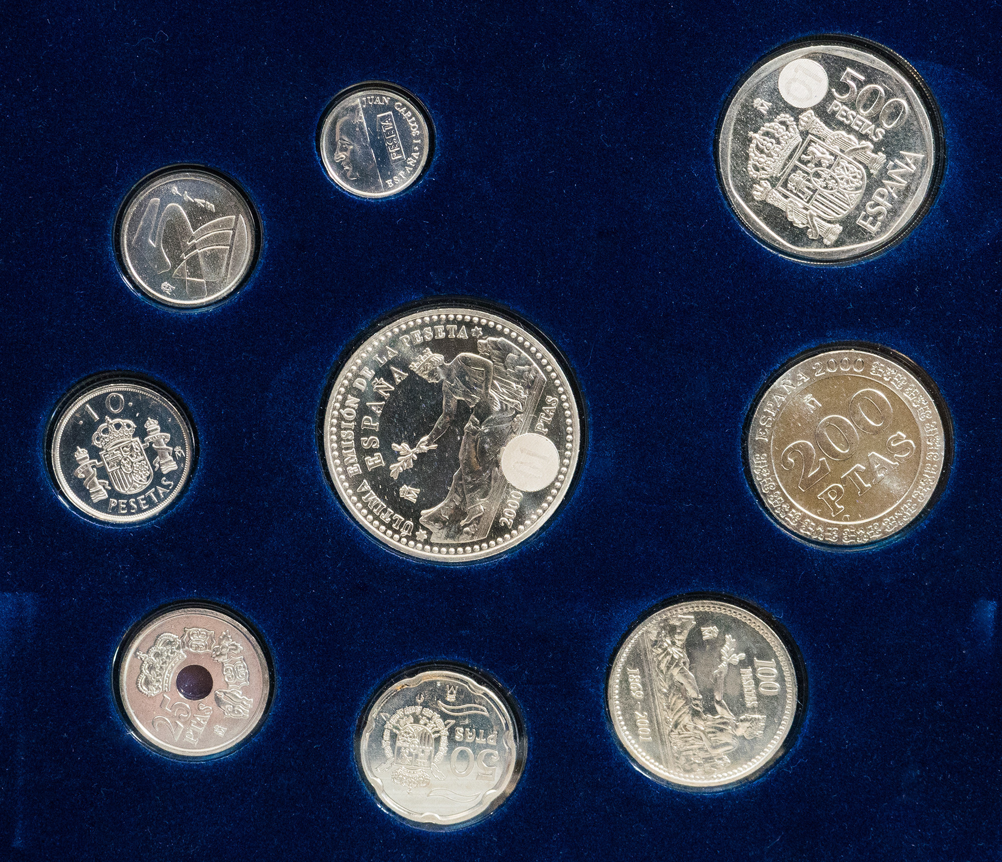 JUAN CARLOS I. Estuche de la FNMT Las últimas pesetas en plata: 1 pta. (AR 2,15 g), 5 pts. (AR 3,9 g), 10 pts. (AR 4,65 g), 25 pts. (AR 5,55 g), 50 pts. (AR 6,55 g), 100 pts. (AR 12 g), 200 pts. (AR 12,3 g), 500 pts. (AR 15,5 g) y 2000 pts. (18 g). Con certificado y acompañado del libro Historia de la peseta, de José María Aledón. SC.