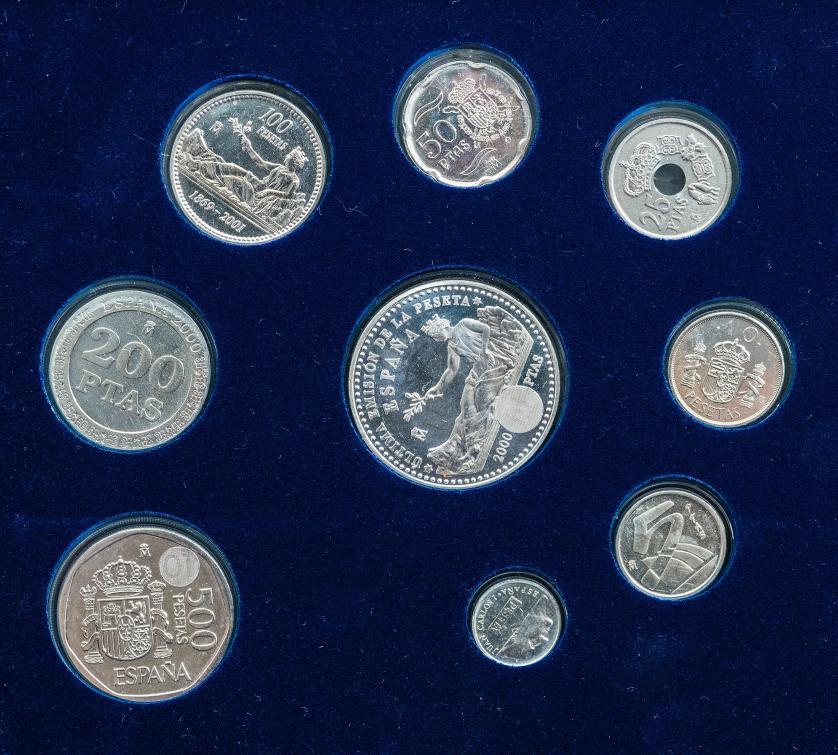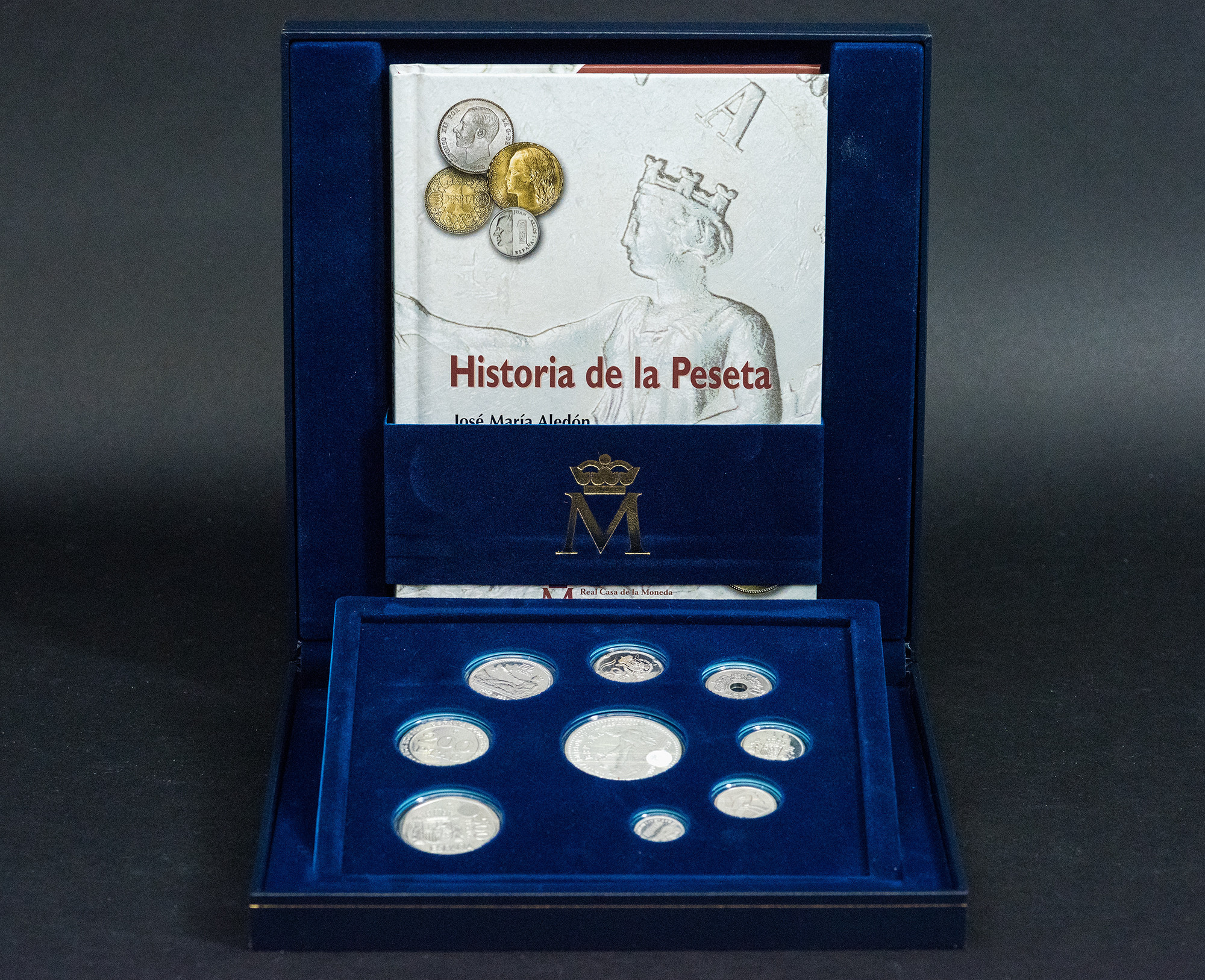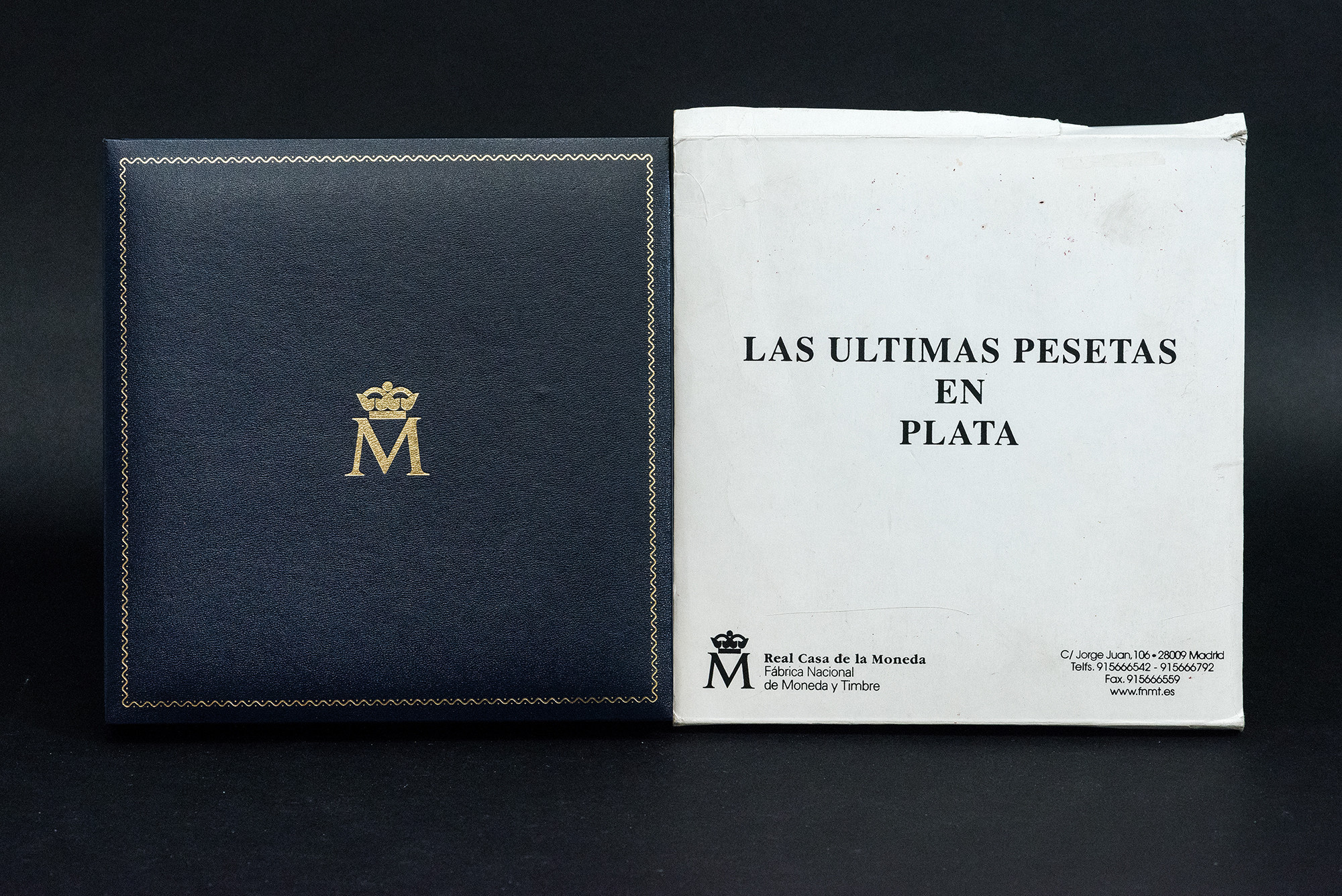 JUAN CARLOS I. Estuche de la FNMT Las últimas pesetas en plata: 1 pta. (AR 2,15 g), 5 pts. (AR 3,9 g), 10 pts. (AR 4,65 g), 25 pts. (AR 5,55 g), 50 pts. (AR 6,55 g), 100 pts. (AR 12 g), 200 pts. (AR 12,3 g), 500 pts. (AR 15,5 g) y 2000 pts. (18 g). Con certificado y acompañado del libro Historia de la peseta, de José María Aledón. SC.